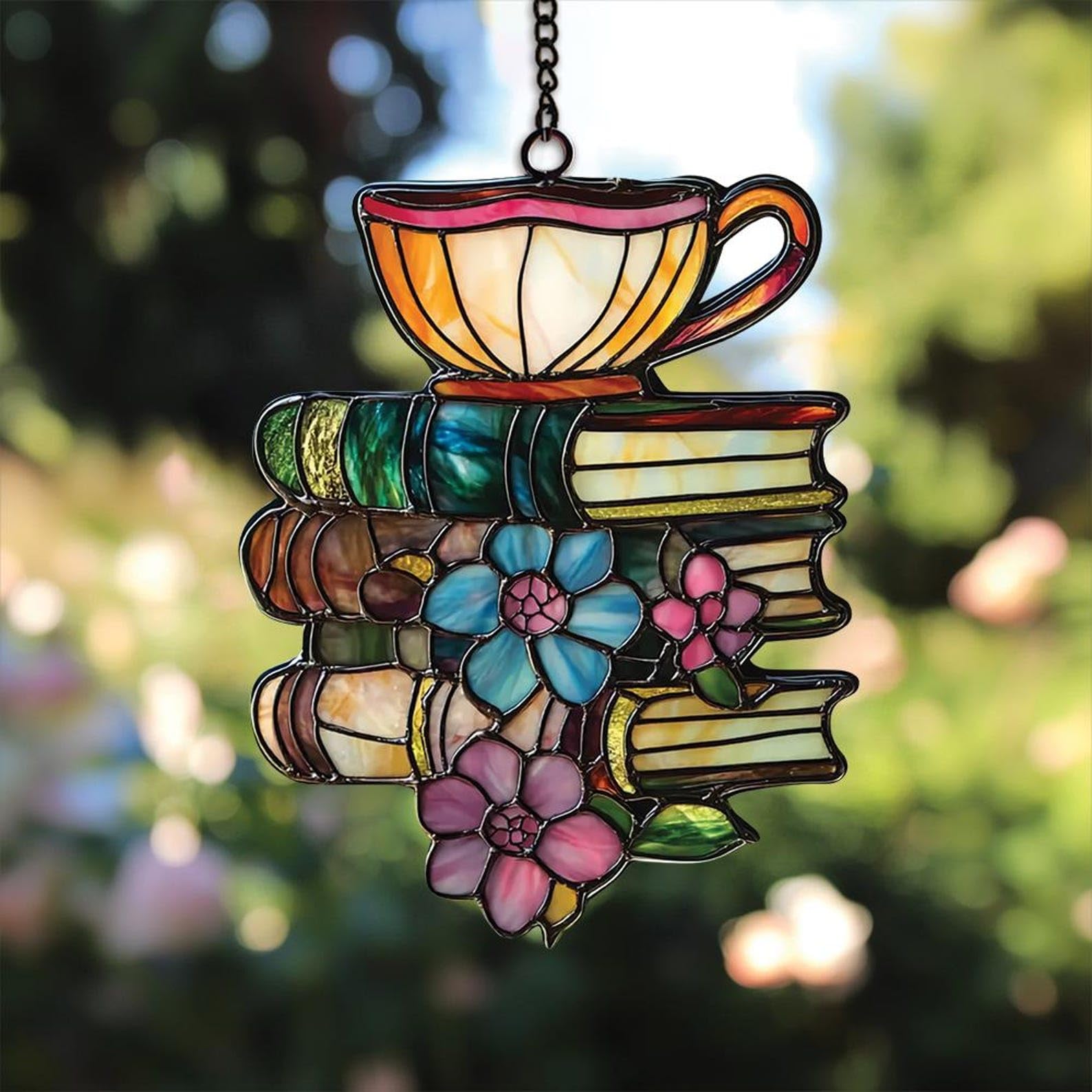 LEEZONE Flower Books and Tea Faux Stained Sun Catcher Suncatcher Ornament Bookish Gift Book Lover Housewarming Catchers Acrylic Windown Suncatchers|Home & Garden