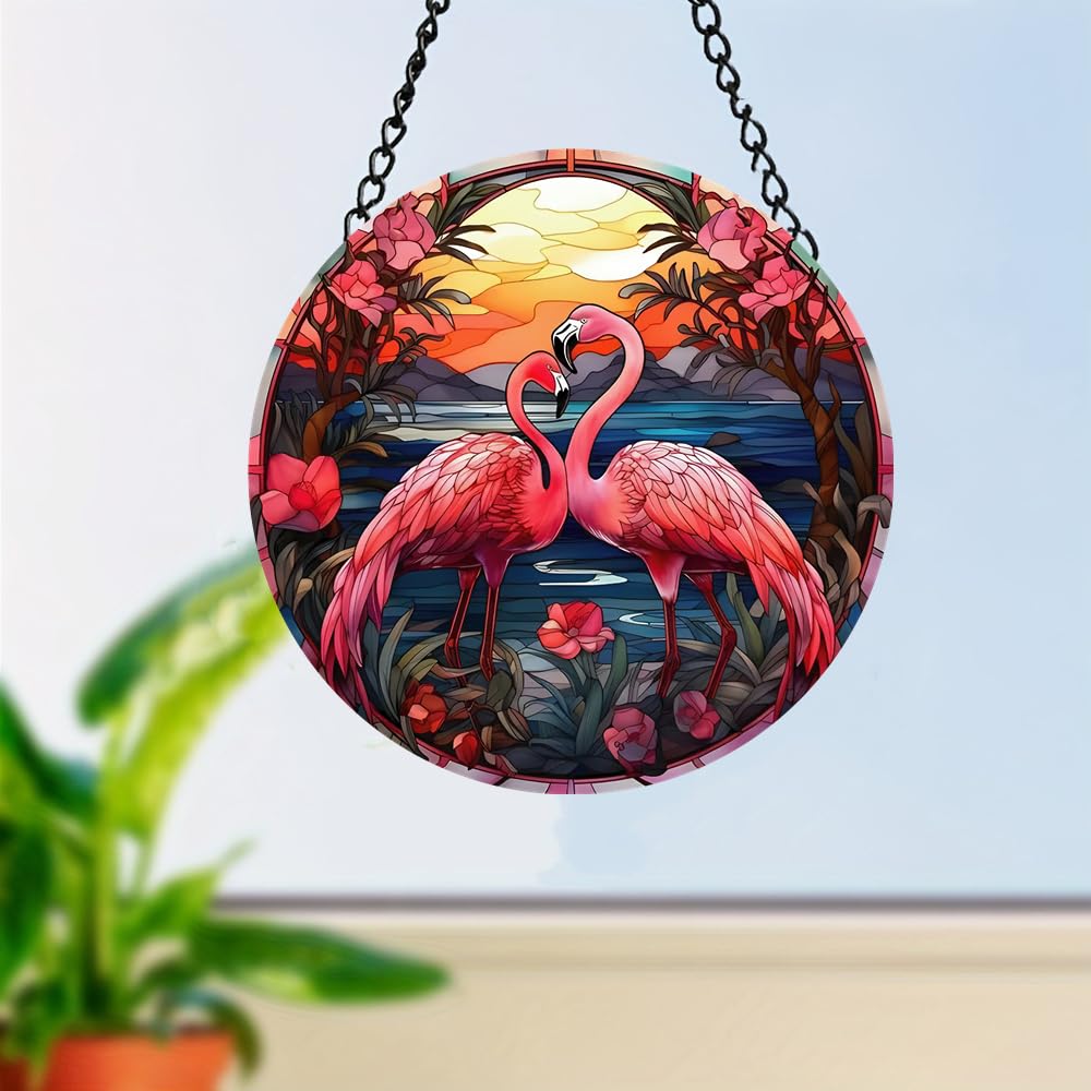 Flowers Flamingo Stained Glass Window Hangings with Chain – Acrylic Landscape Painting Ornament for Garden, Patio and Indoor Decor, Housewarming Gift|Home & Garden