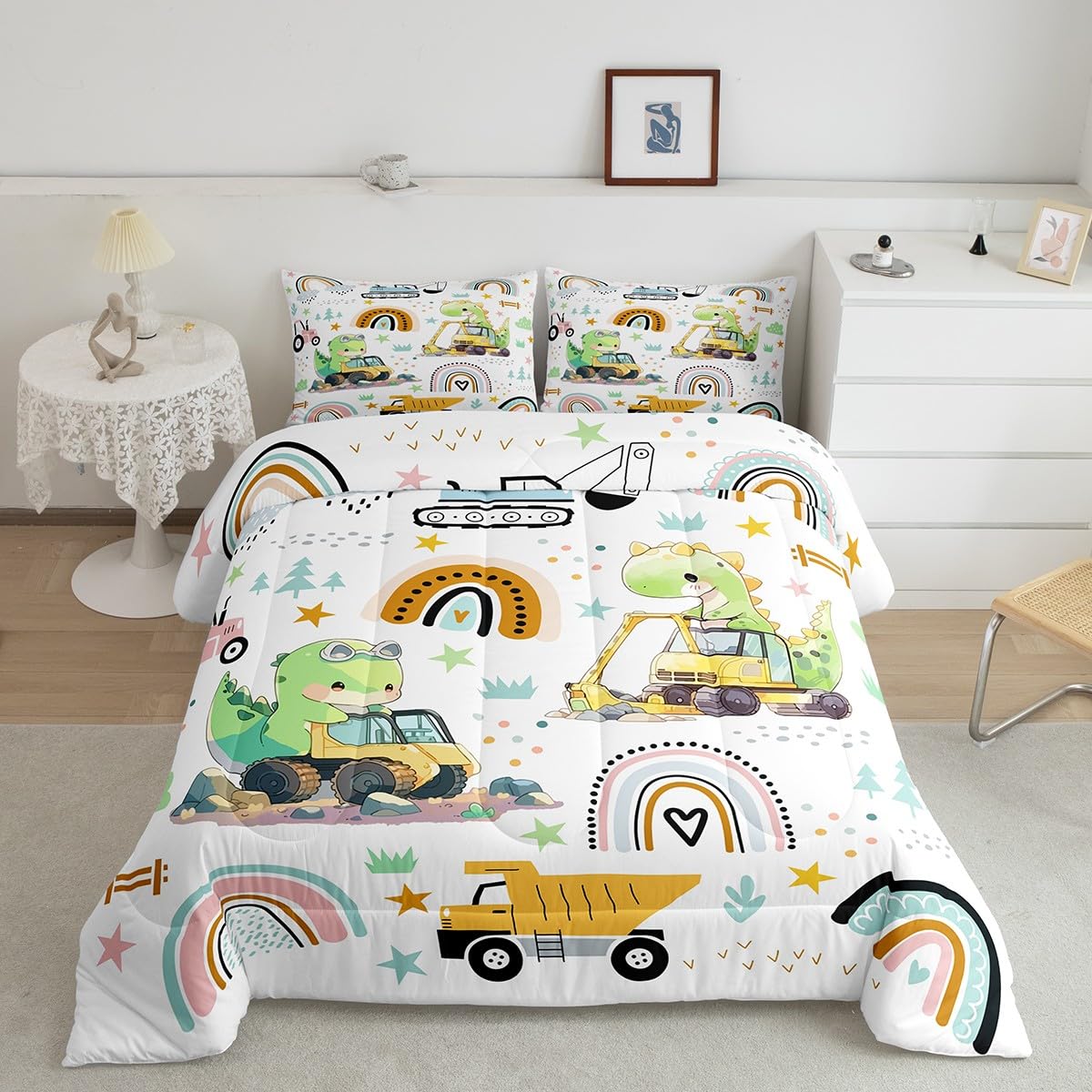 Manfei Kids Dinosaur Comforter Set Twin Size, Excavator Tractor Truck Down Comforter with 1 Pillowcase, Cartoon Rainbow Bedding Set 2pcs for Boys|Home & Garden