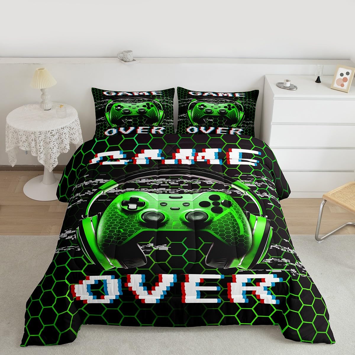 Video Games Comforter Set for Boys Girls,Gaming Headphone Gamepad Gamer All Season Cozy Bedding Set Full Size,Neon Green Honeycomb Modern Geometric|Home & Garden
