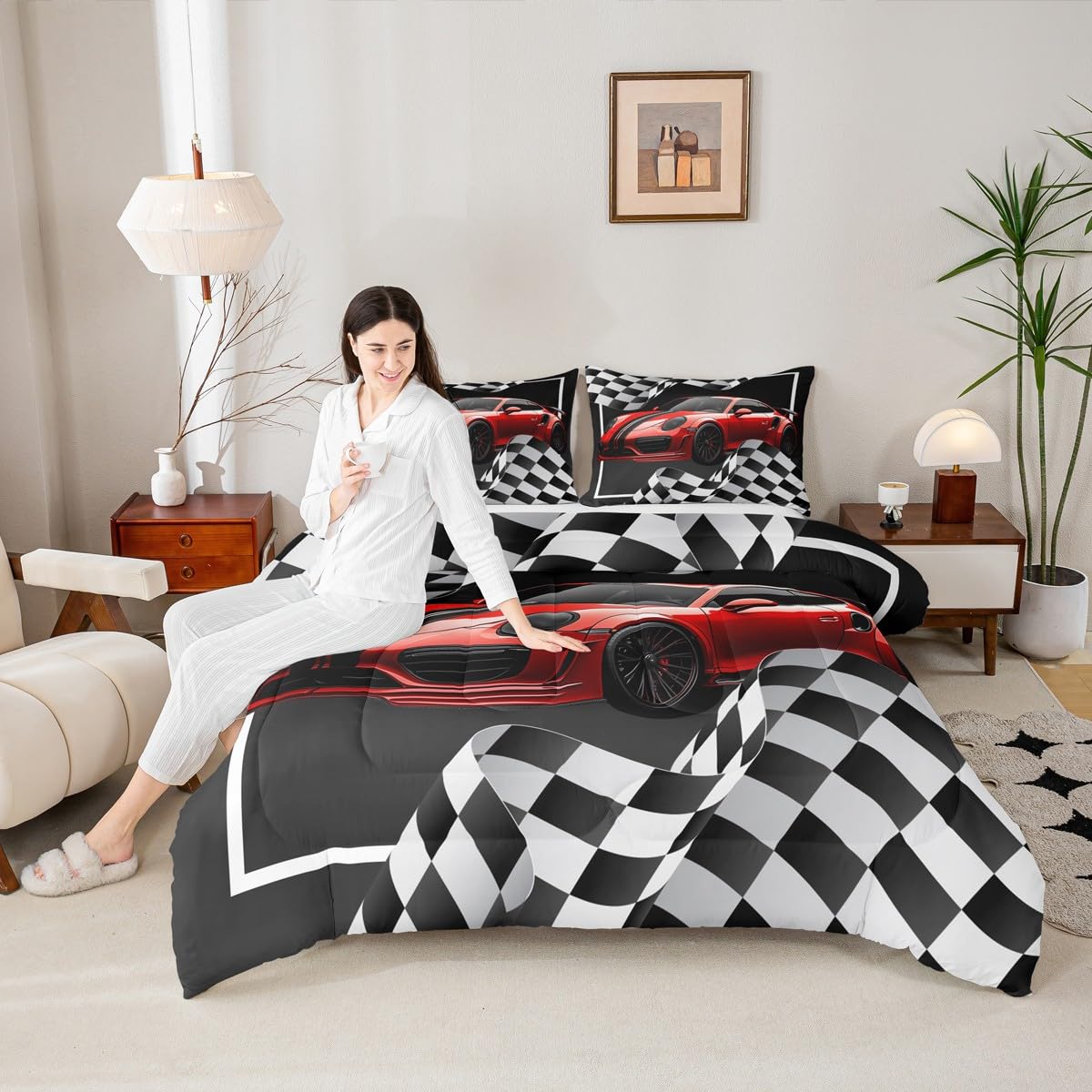 Red Race Car Comforter Set Queen Size, Black White Plaids Geometric Bedding Set 3pcs for Kids Teens Boys Men Room Decor,Extreme Sports Games Racing|Home & Garden
