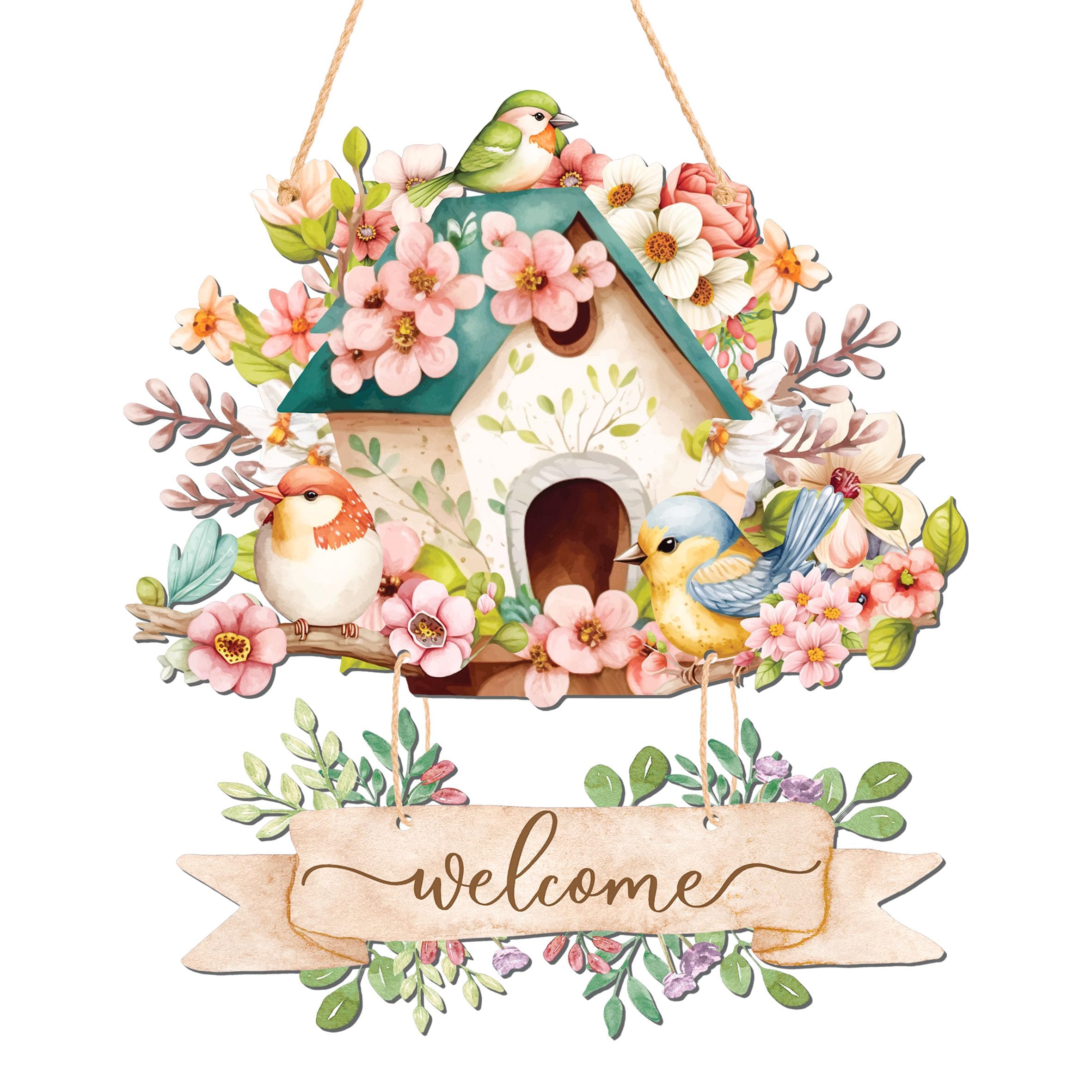 INKNOTE Decorative Spring Door Hangers Welcome Sign Blooming Flowers Birdhouse Wall Tags Plaque for Farmhouse Porch Front Yard Ornament Ironwork|Home & Garden