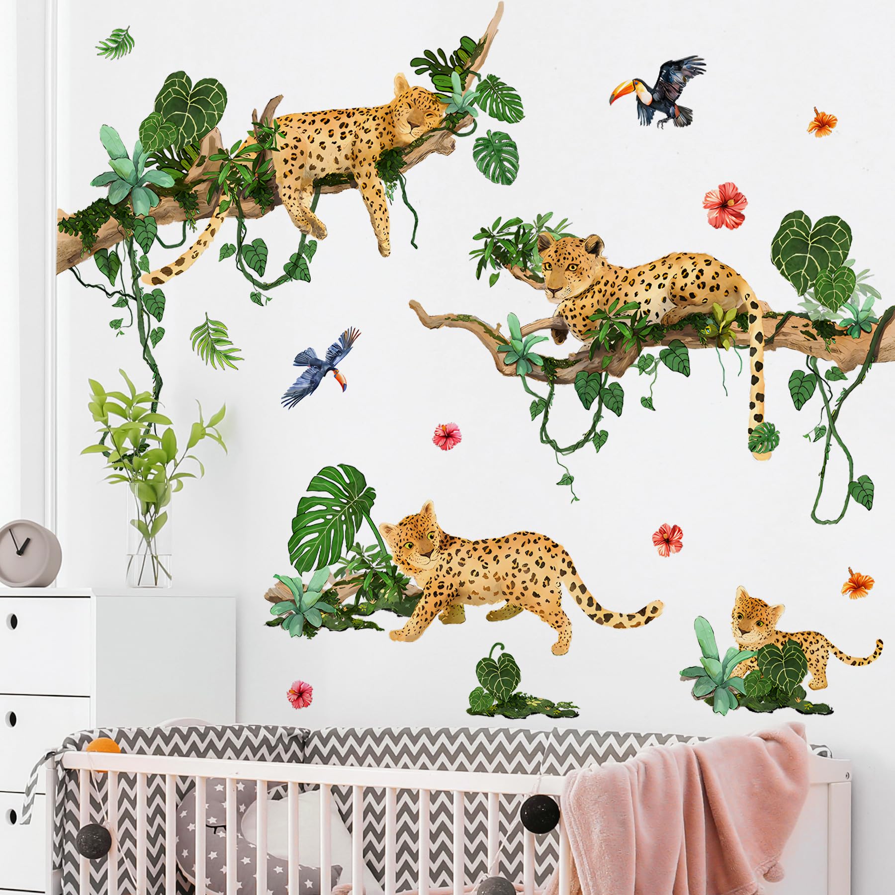 DTLIFEK Jungle Animals Leopard Wall Decals Leopard on Tree Branch Vine Wall Stickers Wild Animal Tropical Plant Leaf Tree Wall Art Vinyl Removable|Home & Garden