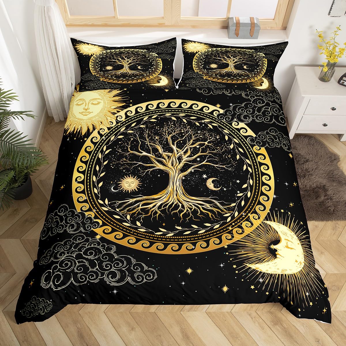 Manfei Sun and Moon Comforter Cover Queen Size Gold Sun Moon Print Duvet Cover Set Tree of Life Bedding Set 3pcs for Kids Boys Girls Outer Space|Home & Garden