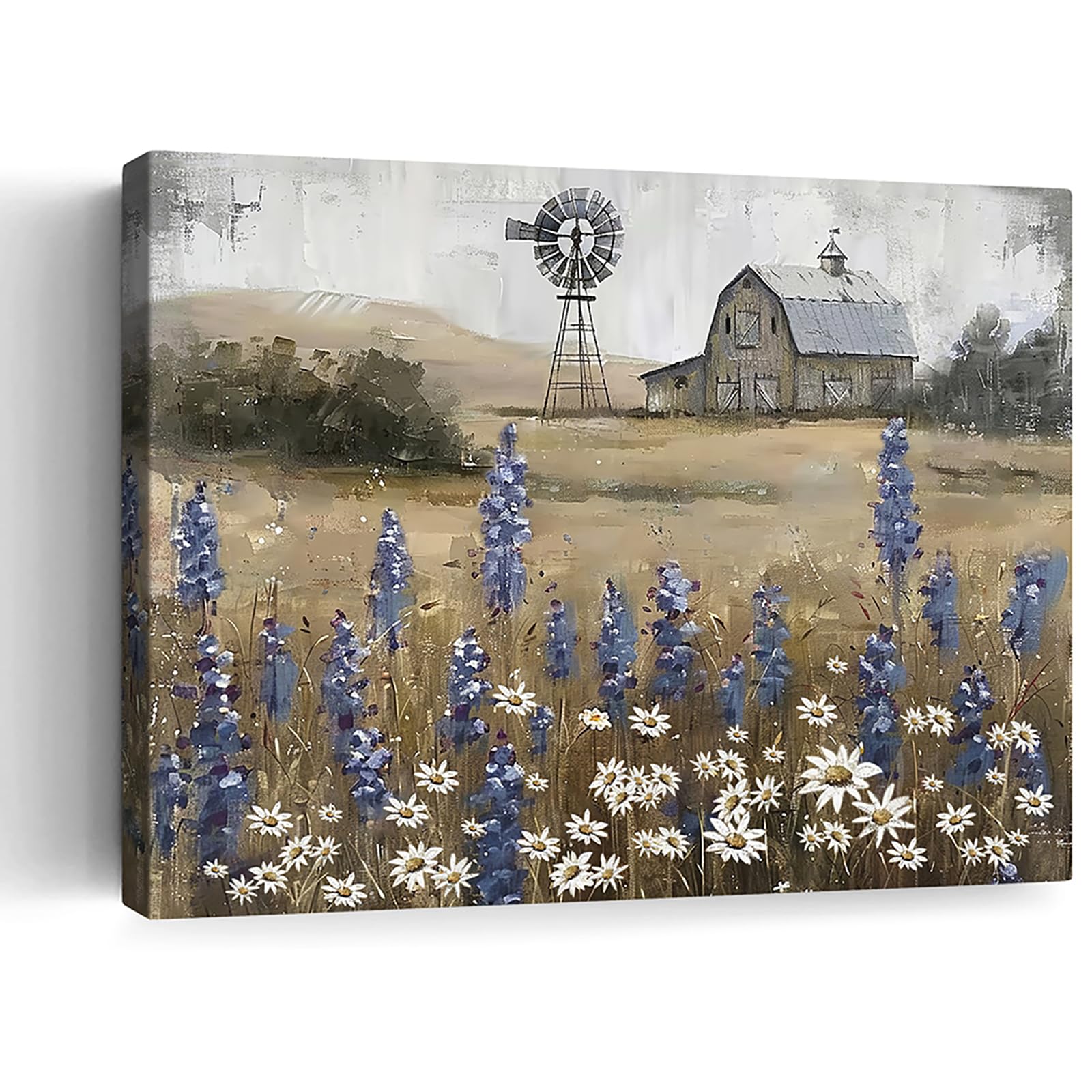 Vintage Farmhouse Canvas Print Retro Countryside Flower Field Meadow Landscape Rustic Windmill Barn Picture Framed Artwork Lavender Daisy Picture Art|Home & Garden