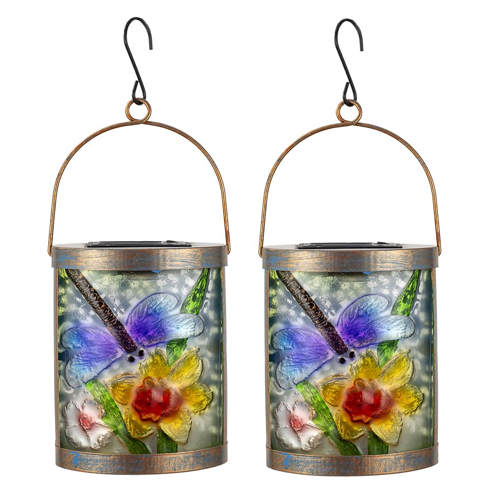 SUNNYSOLAR 2 Pack Dragonfly Hanging Solar Lanterns Outdoor Waterproof Decorative Glass LED Solar Lantern for Tabletop Garden Patio Decor|Home & Garden