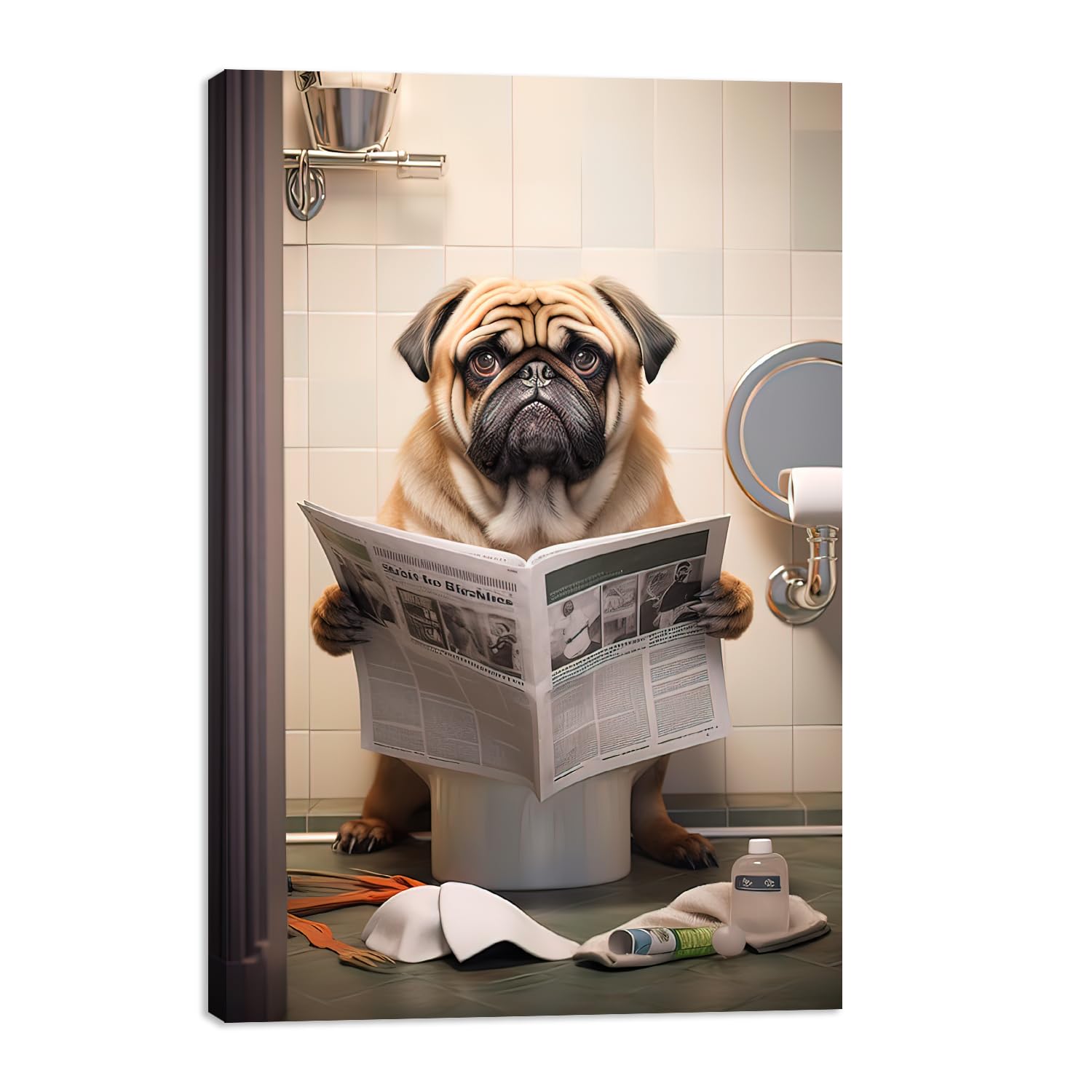 MODOJOART Pug Bathroom Canvas Wall Art, Pug Reading Newspaper on Toilet Painting Print Funny Animal Bathroom for Restroom Washroom Decor(Artwork-11,|Home & Garden