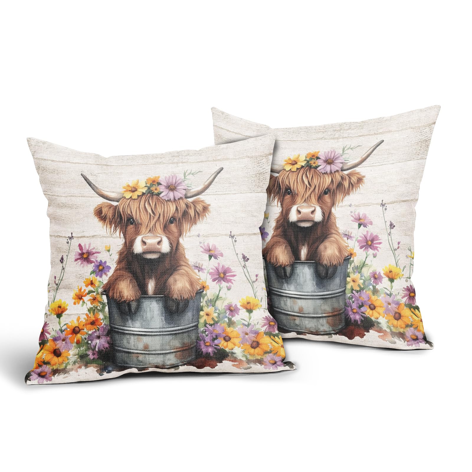 Evlaschin 2PCs Highland Cow Pillow Covers, Watercolor Spring Daisy Cattle Bucket Pillowcases 16x16inch, Wood Board Wildflower Cotton Linen Sofa Couch|Home & Garden