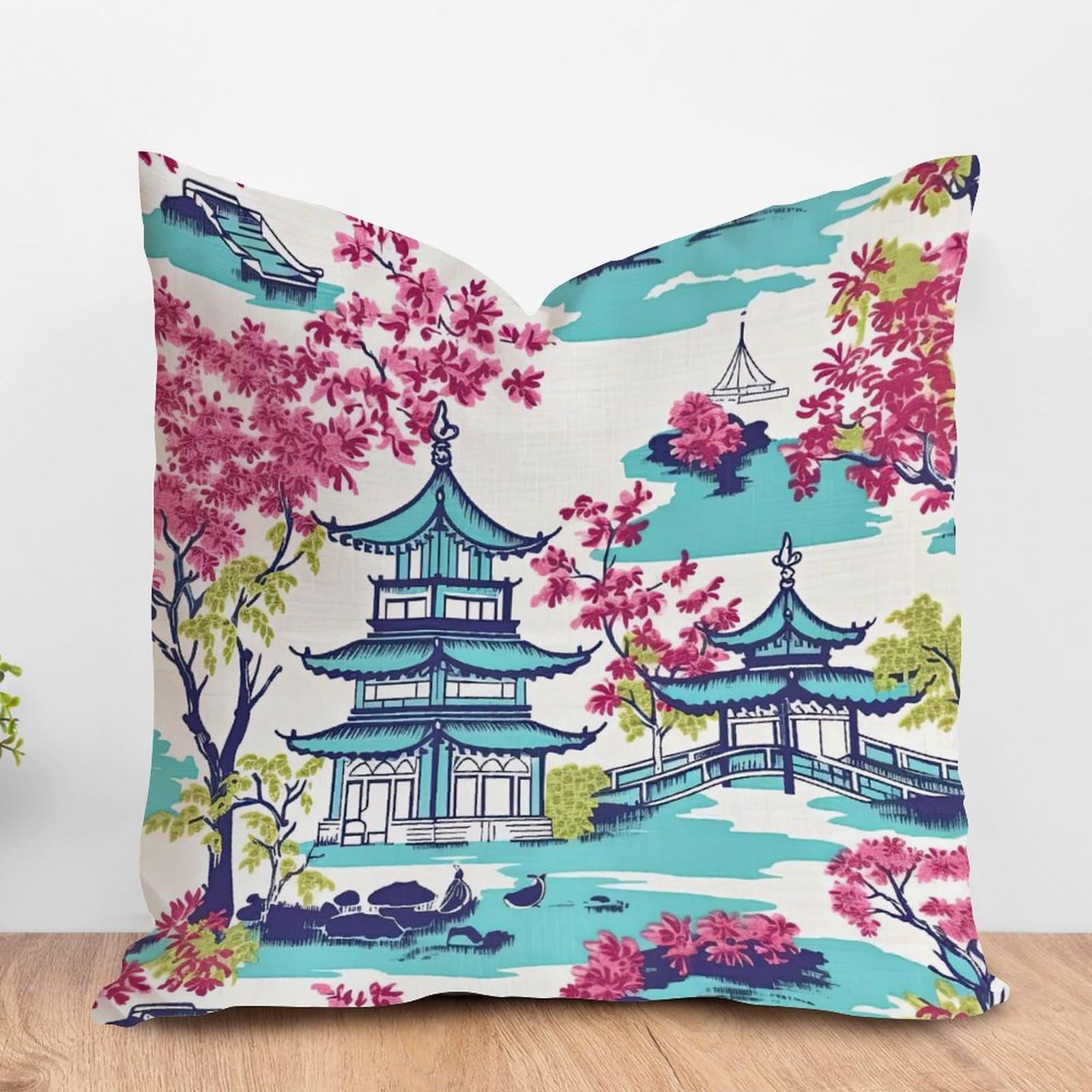 ArogGeld Aqua Blue Pagoda Coral Pink Flower Throw Pillow Cover Asian Teal Turquoise Pagoda Decorative Sofa Cushion Cover Chinoiserie Style Farmhouse|Home & Garden