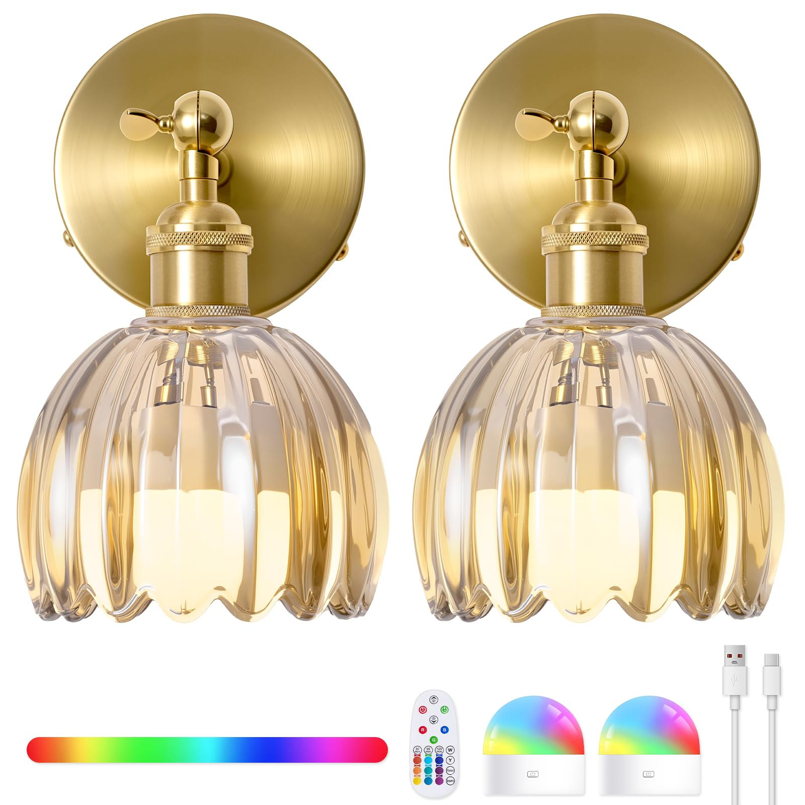 BlesULuk Vintage Battery Operated Wall Sconces - 5000mAh Wireless Rechargeable RGB Dimmable Lights - Set of 2 Powered Light Sconce - Cognac Tulip|Home & Garden