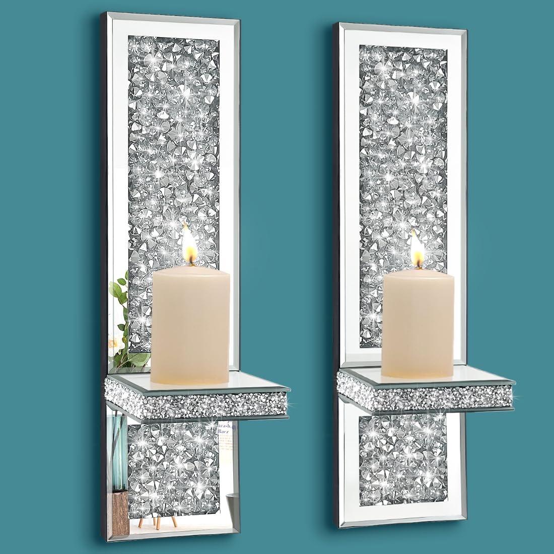 Pibeyer Crystal Crush Diamond Wall Candle Holder Set of 2, Silver Mirrored Candle Sconces, Home Wall Decoration for Living Room,Dining Room & Bedroom|Home & Garden