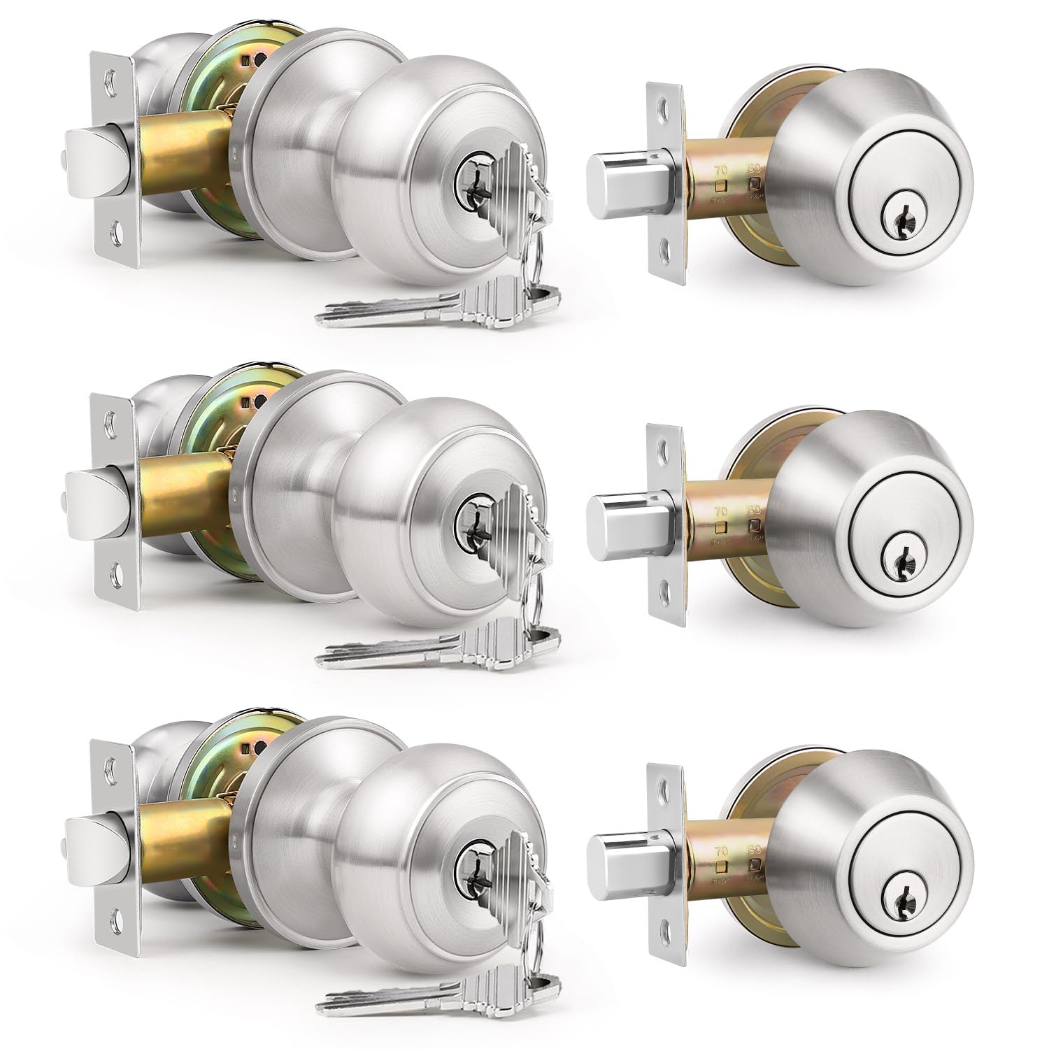 Brotima 3 Pack Keyed Alike Front Door Knob and Deadbolt Set, Entry Door Locksets with Single Cylinder Deadbolt, Satin Nickel Flat Round Door Lock Set|Home & Garden