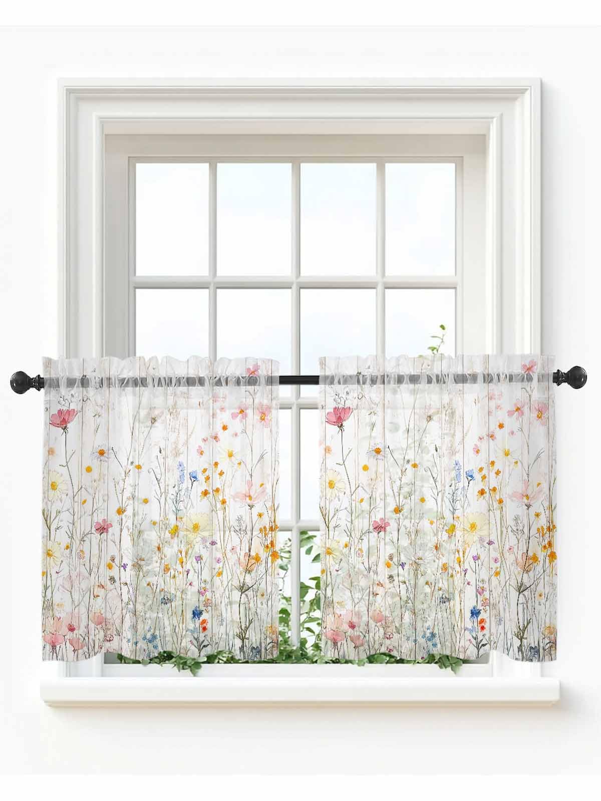 Spring Flowers Sheer Kitchen Tier Curtains 24 inch length, Botanical Florals Small Half Curtains, Rod Pocket Vanlance Watercolor Wildflowers Short|Home & Garden
