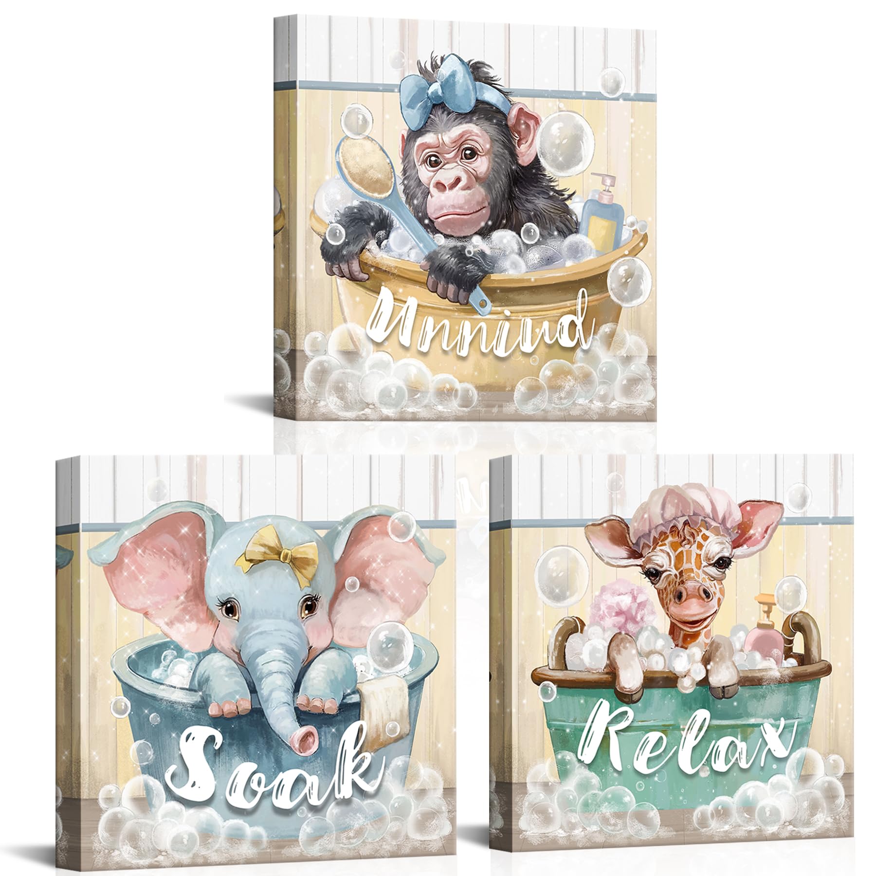 Sepwrol Funny Bathroom Wall Art Cute Animal Giraffe Elephant Orangutan In Bathtub Bathing Canvas Picture Wall Decor for Kids Room Bathroom 12x12inchx3|Home & Garden