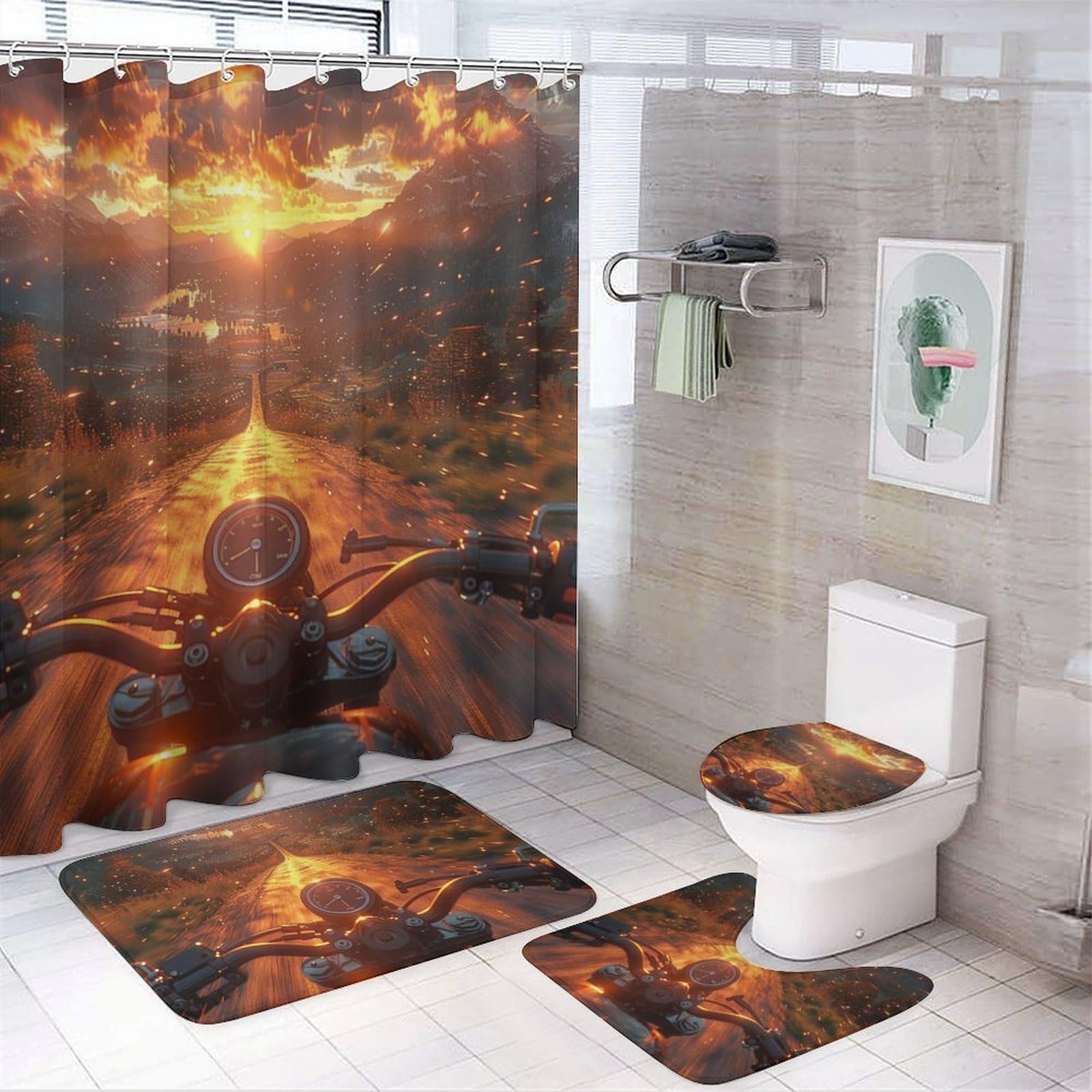 HDESDIS 4Pcs Forest Road Motorcycle Shower Curtain Sets, Bath Mat and Rugs, Nature Sunset Jungle Mountain Shower Curtain with Hooks for Bathroom|Home & Garden