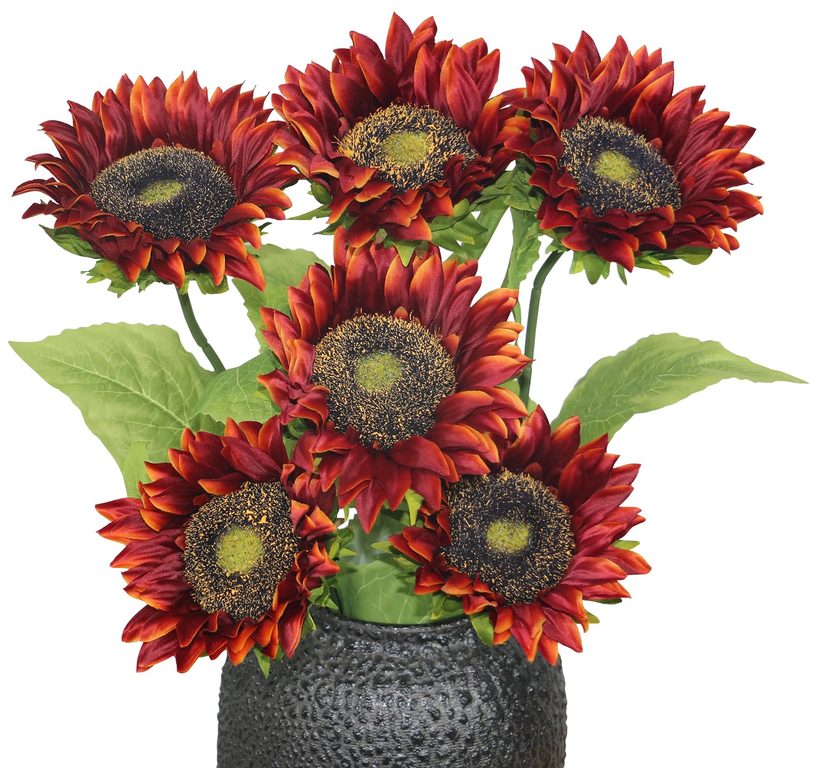 Olrla Long Stem Artificial Sunflowers 6pcs, Red Silk Faux Sunflower for Flowers Arrangement Wedding Bouquet Table Centerpieces Home Office Decoration(|Home & Garden