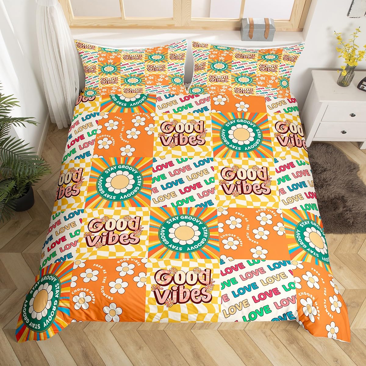 Feelyou Retro Hippie Flower Bedding Set 60S 70S Groovy Comforter Cover Set for Kids Teens Orange Flowers Themed Plaid Duvet Cover Bedspread Cover Room|Home & Garden