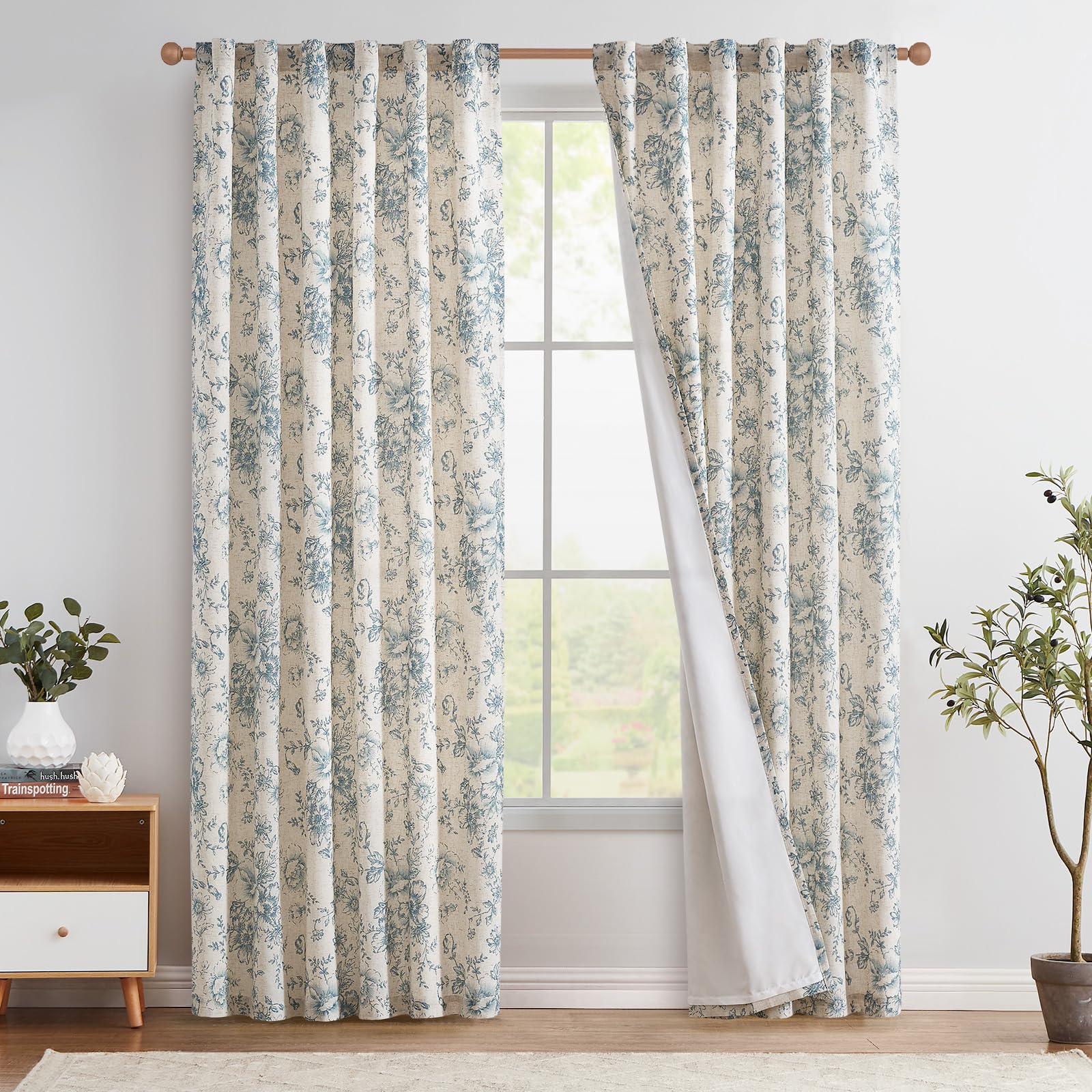 jinchan Lined Linen Blend Curtain Floral Curtains for Living Room 90 Inches Long Blue Peony Flower Printed Curtain Rod Pocket Back Tab Farmhouse|Home & Garden