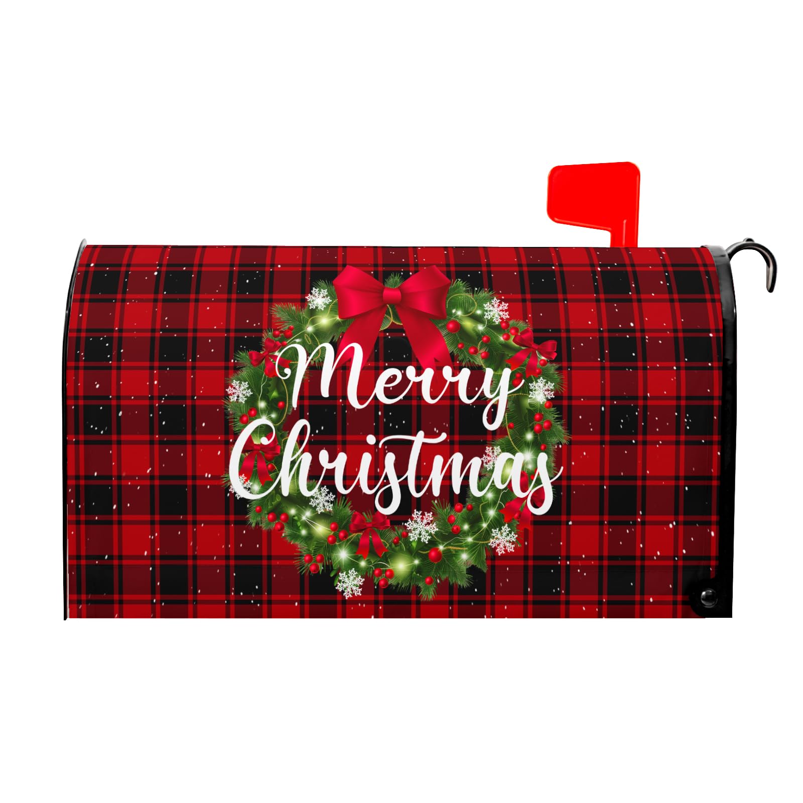 Kawani Merry Christmas Mailbox Cover - Magnetic Standard Size 21x18 Inch Winter Christmas Wreath Red Black Buffalo Plaid Xmas Holiday Wrap for Garden|Home & Garden