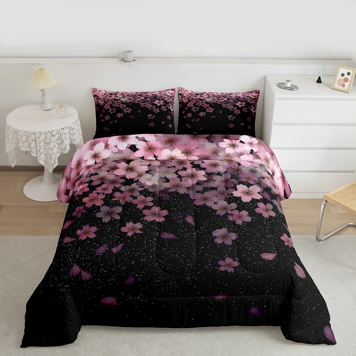 Erosebridal Cherry Blossom Comforter Set Full Size, Pink Flower Down Comforter, Petal Floral Quilted Duvet, Starry Sky Glitter Girly Warm Duvet Insert|Home & Garden