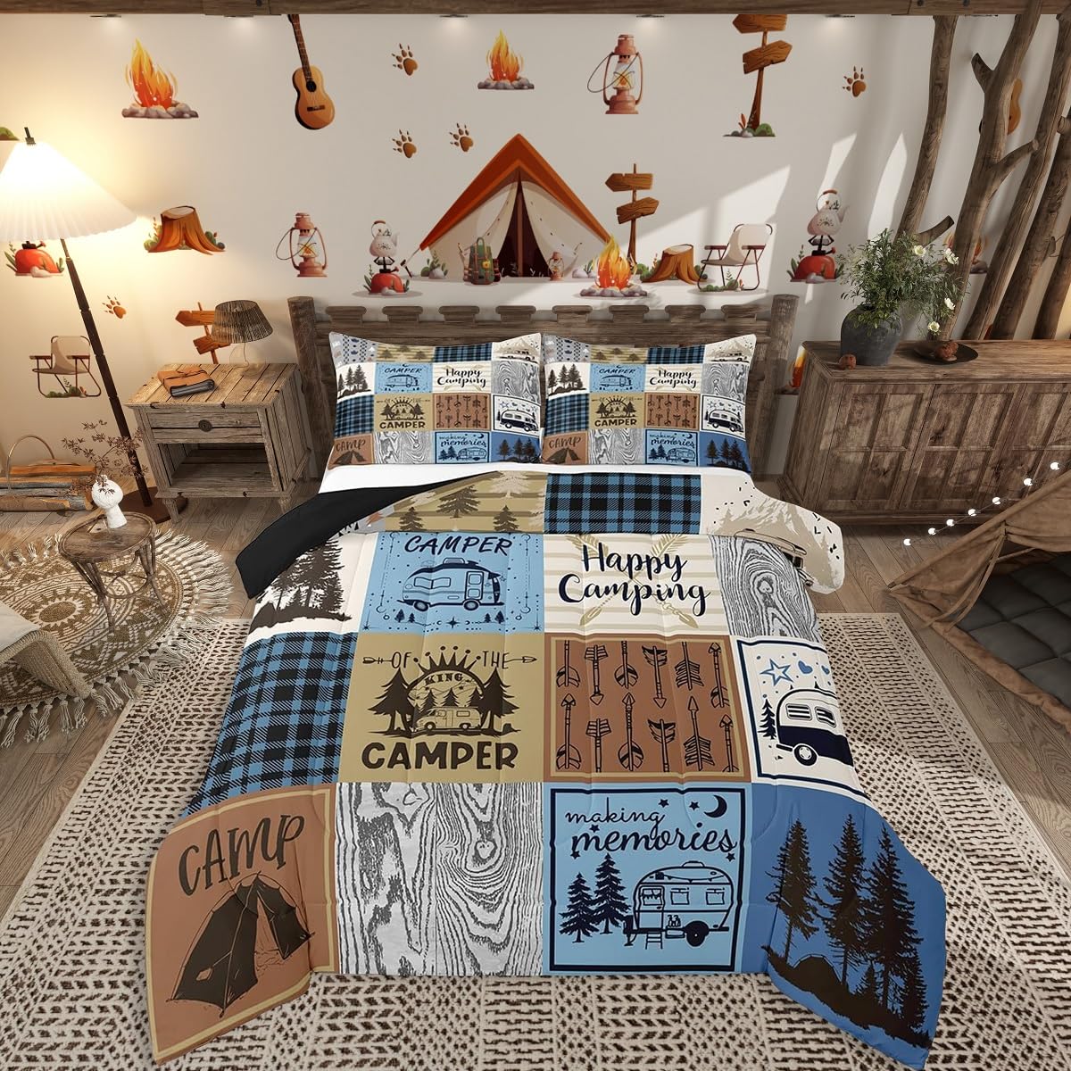 Erosebridal Happy Camping Bedding Set Queen Rv Camper Comforter Set for Travel Trailers Bunks,Patchwork Rustic Buffalo Plaid Pine Trees Camper Car|Home & Garden