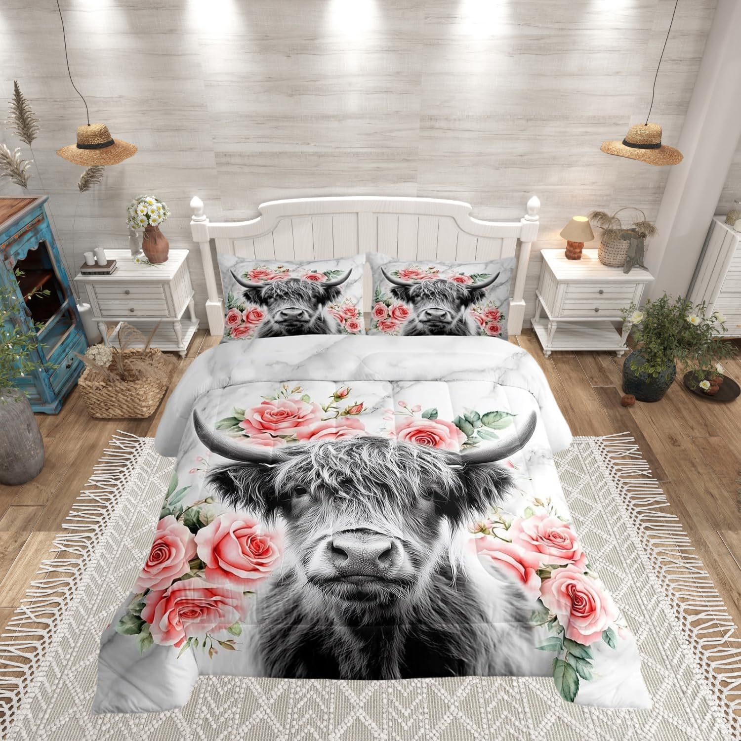Erosebridal Highland Cow Flower Comforter Set Queen Size Bull Cattle Bedding Set Western Funny Animal Bedding Set Wildlife Farmhouse Cow Quilt Set|Home & Garden