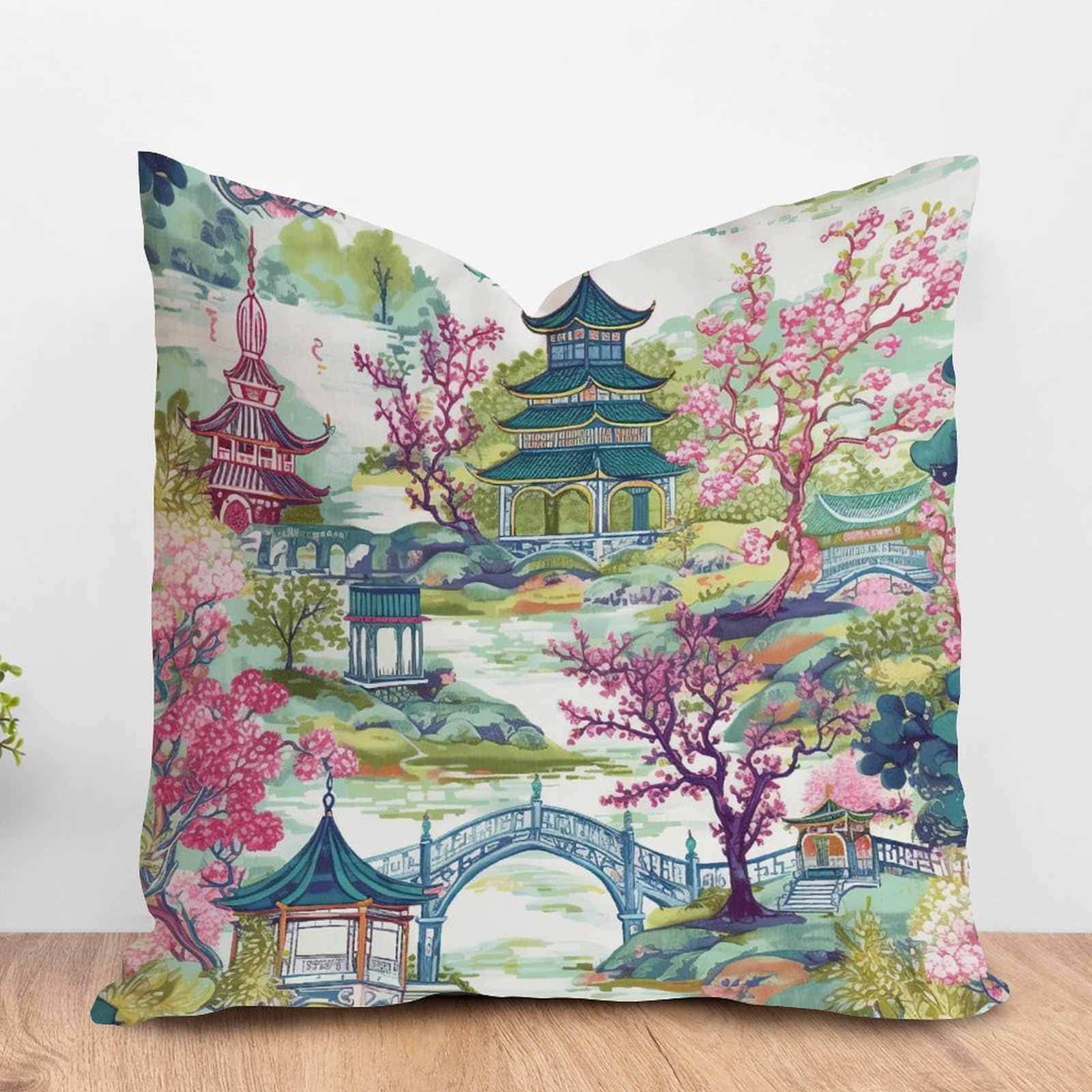 ArogGeld Traditional Chinese Chinoiserie Cushion Covers Pagoda Green Pink Flower Throw Pillows Asian Dark Green Pagoda Pillow Cases Farmhouse Decor|Home & Garden