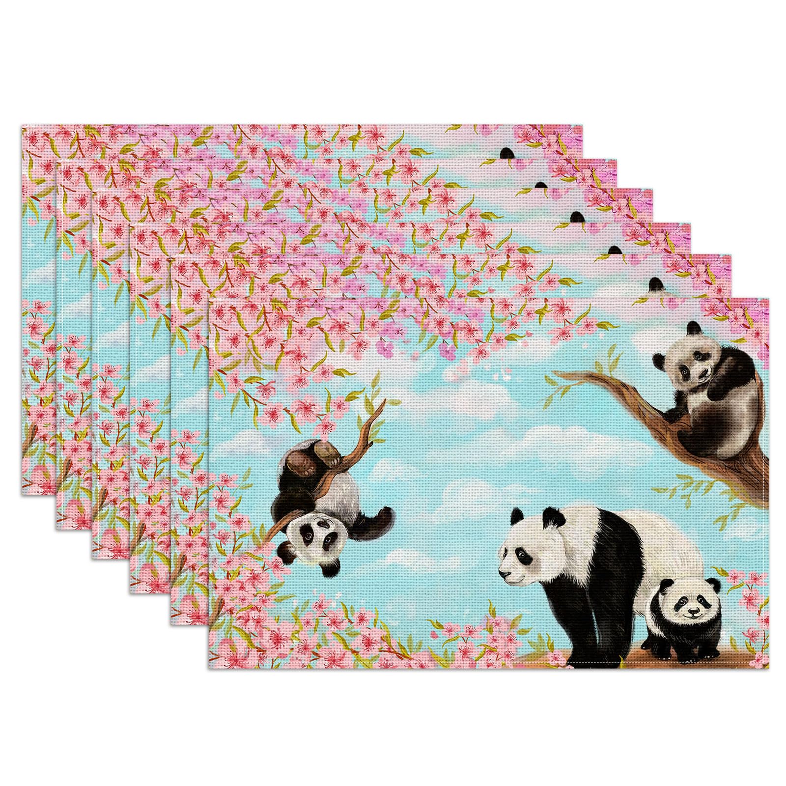 Cute Panda Placemats Set of 6, Sakura Tree Linen Place Mat Washable Stain Resistant Table Mats for Farmhouse Kitchen Dining Holiday Party Wedding|Kitchen & Dining