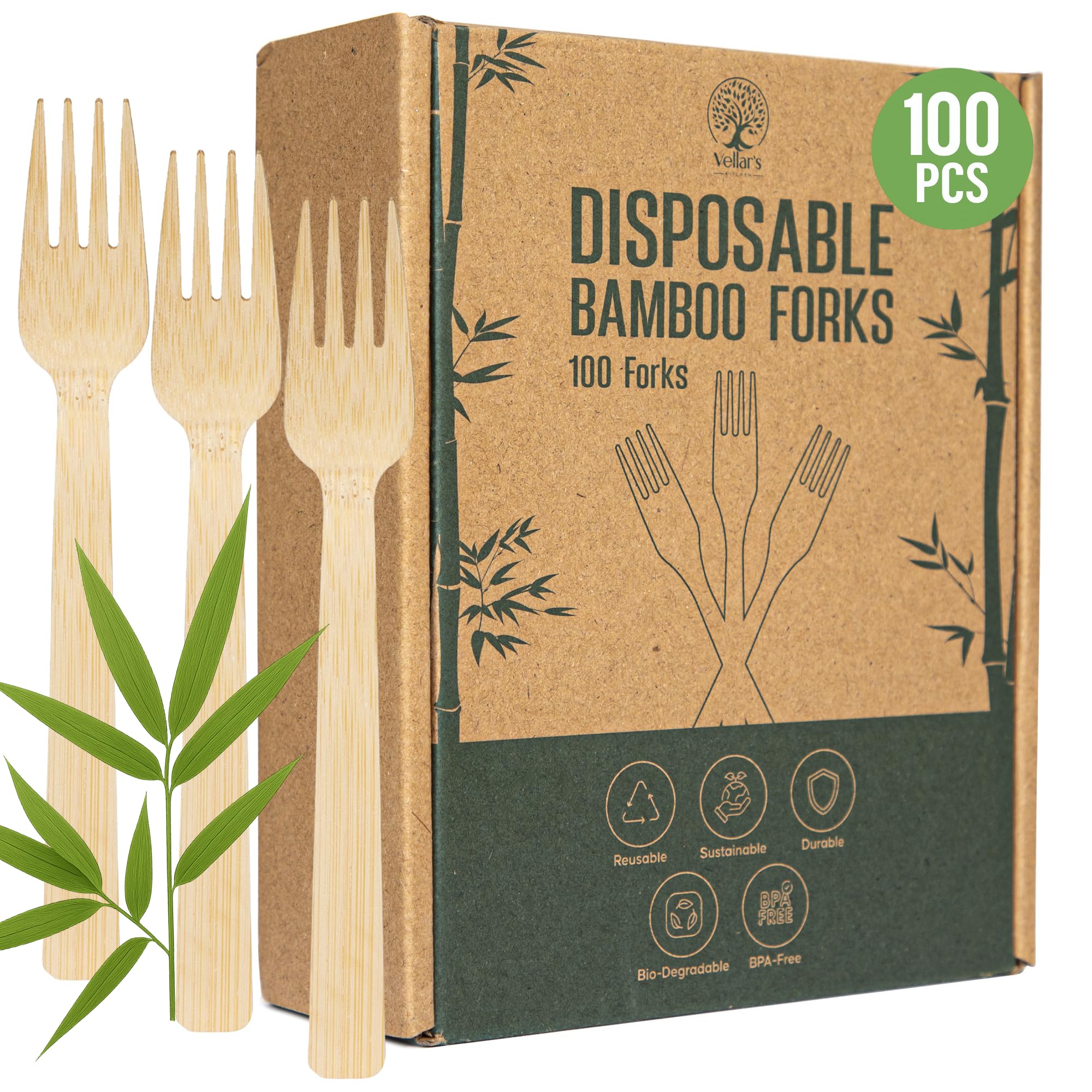 High-End Disposable Bamboo Forks, 100-Count Set; BPA Free Splinter-Free Biodegradable & Ethically Sourced Compostable Cutlery Perfect for Appetizers|Kitchen & Dining