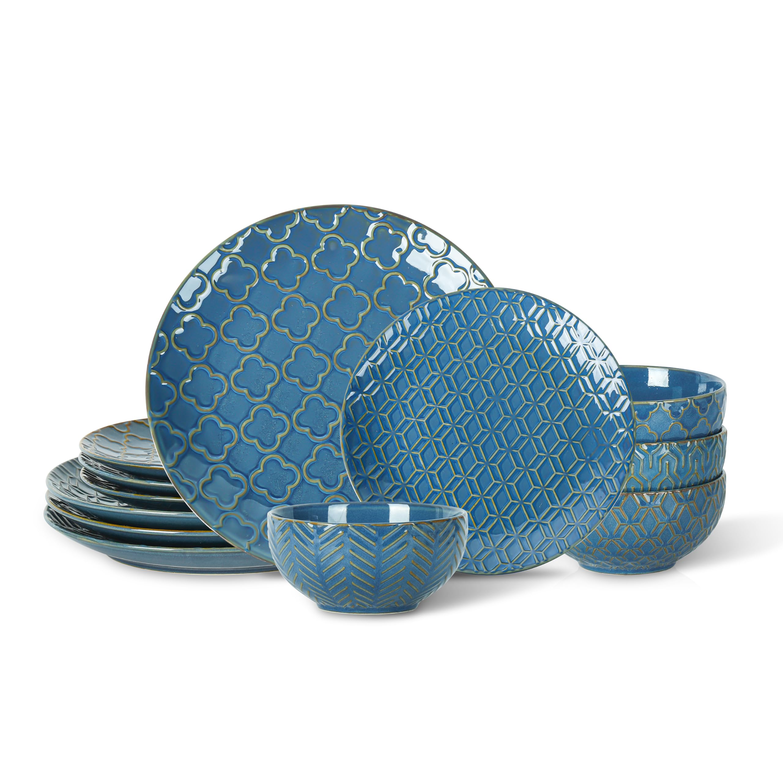 Sureasy 12-Piece Ceramic Dinnerware Set for 4 - Embossed Plates and Bowls Sets, Scratch Resistant Dish Set, Microwave, Oven & Dishwasher Safe, Blue|Kitchen & Dining