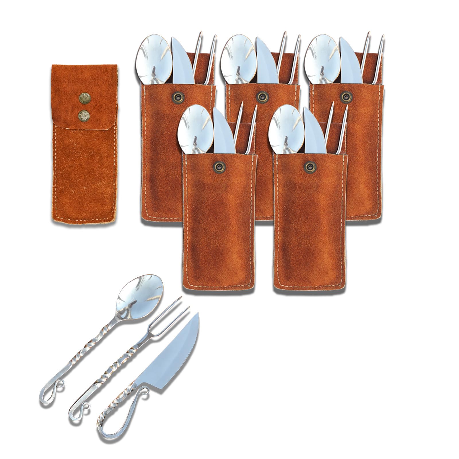 15 Pieces Viking Medieval Cutlery Set - Hand Forged Feasting Set With 3 Piece Carbon Steel Blade, Flatware Twisted Pattern Eating Utensils, Leather|Kitchen & Dining