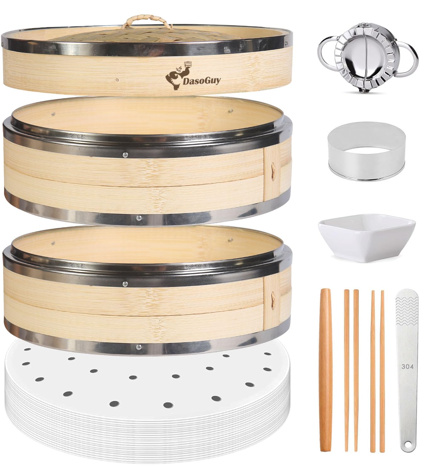 Bamboo Steamer Basket, Stainless Steel Reinforced Rim, 10-Inch 2-Tier Steamer for Cooking, 50 Liners Chopsticks Sauce Dish Dumpling Makers, Steaming|Kitchen & Dining