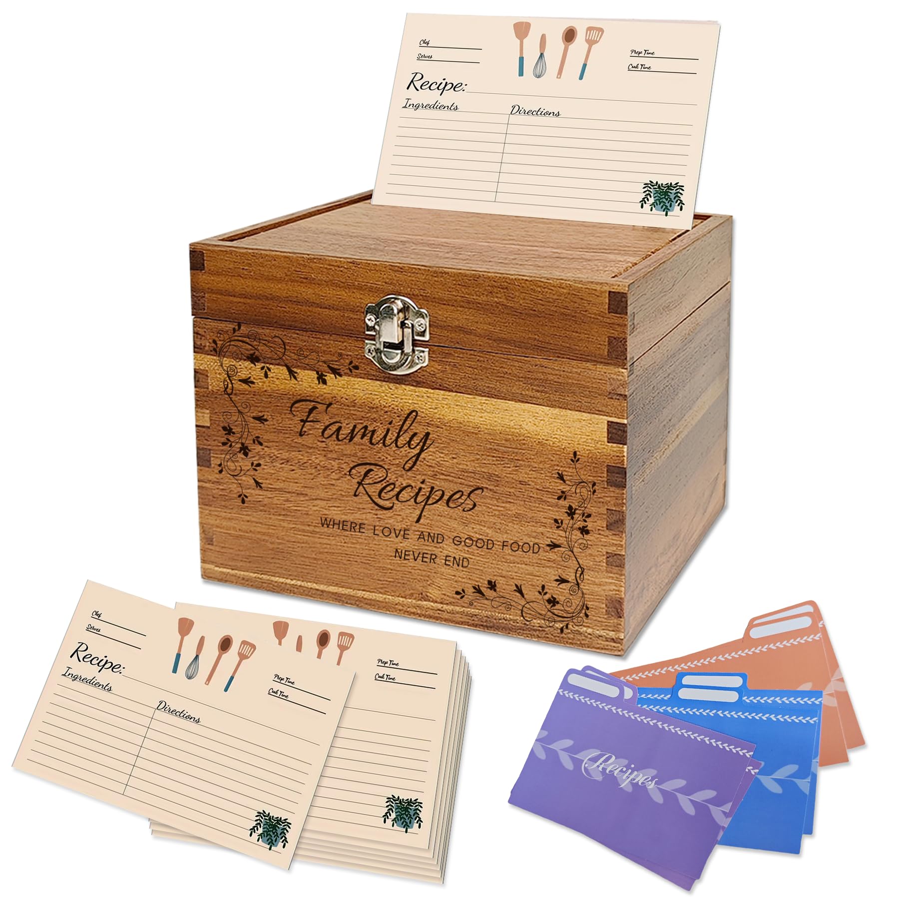 YOJO Wooden Recipe Box With 50 Double Sided 4x6 Recipe Cards and 6 Dividers, Ideal Gift for Christmas, Mother's Day, Wedding, Birthday, Anniversary (|Kitchen & Dining