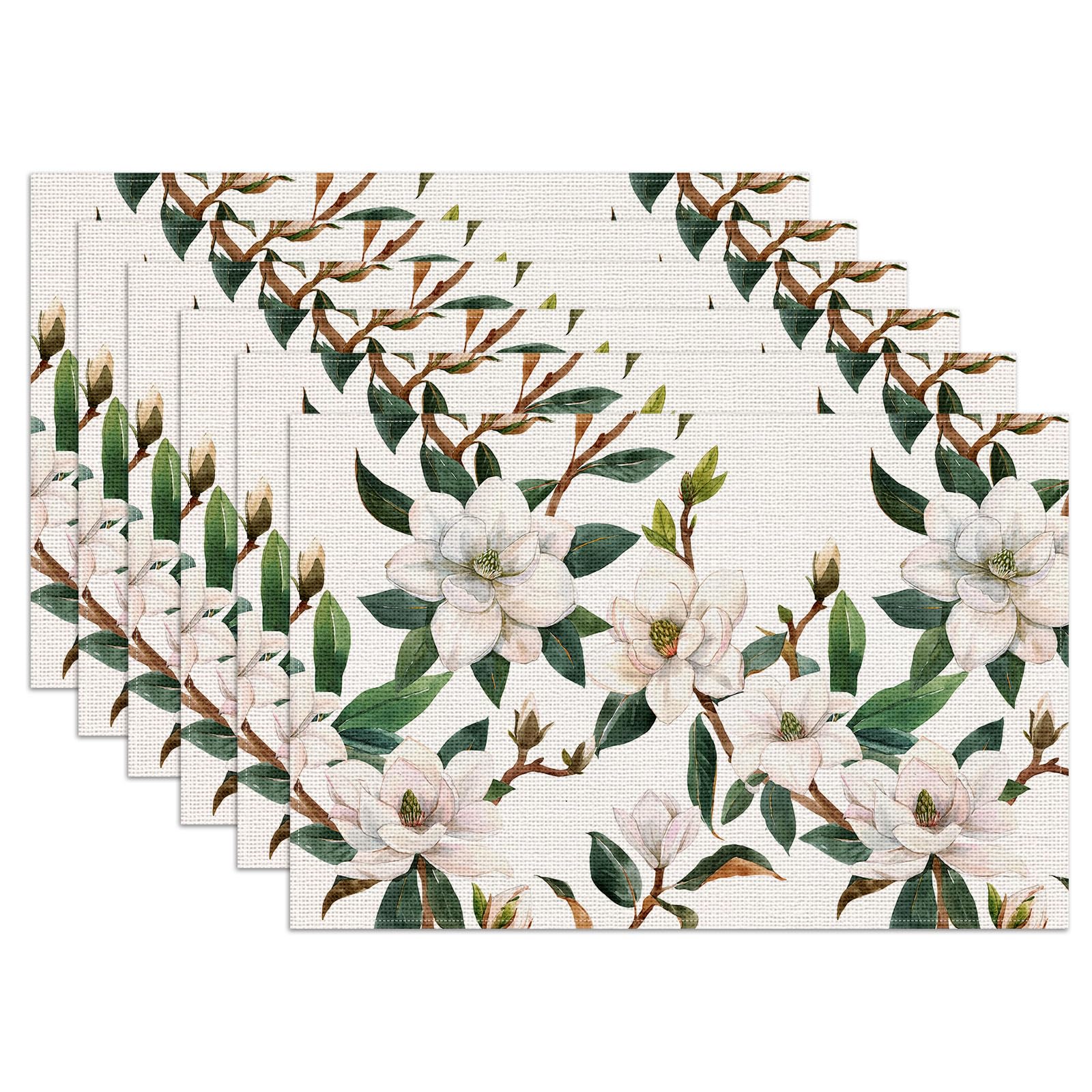 White Magnolia Flower Placemats Set of 6,Summer Flower Linen Place Mat Washable Stain Resistant Table Mats for Farmhouse Dining Party 12x18 Inch|Kitchen & Dining