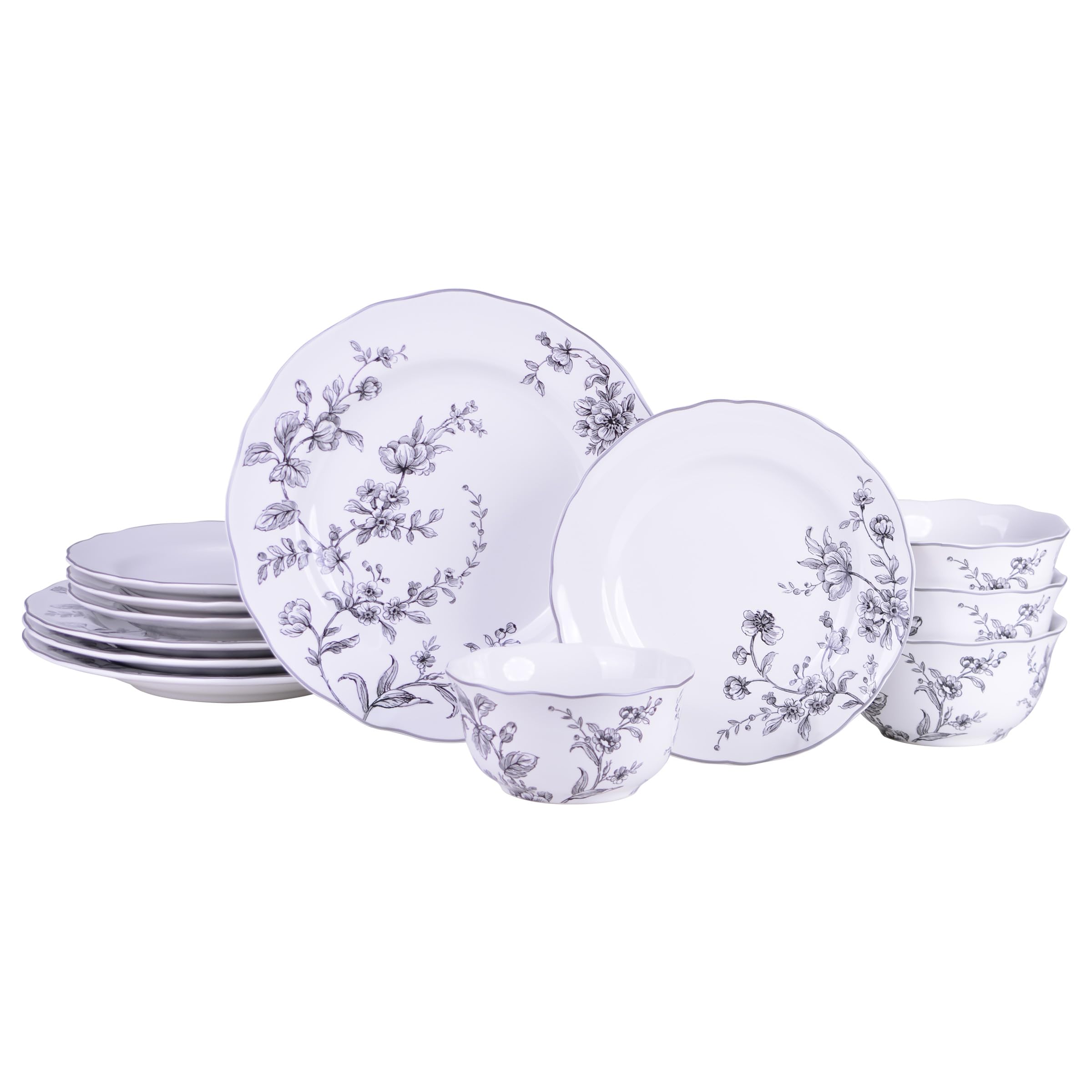 222 Fifth 12-Piece Porcelain Dinnerware Set for 4, White & Black Plates and Bowls Set, Glossy Ceramic Dish Set with Delicate Floral Design, Elegant|Kitchen & Dining