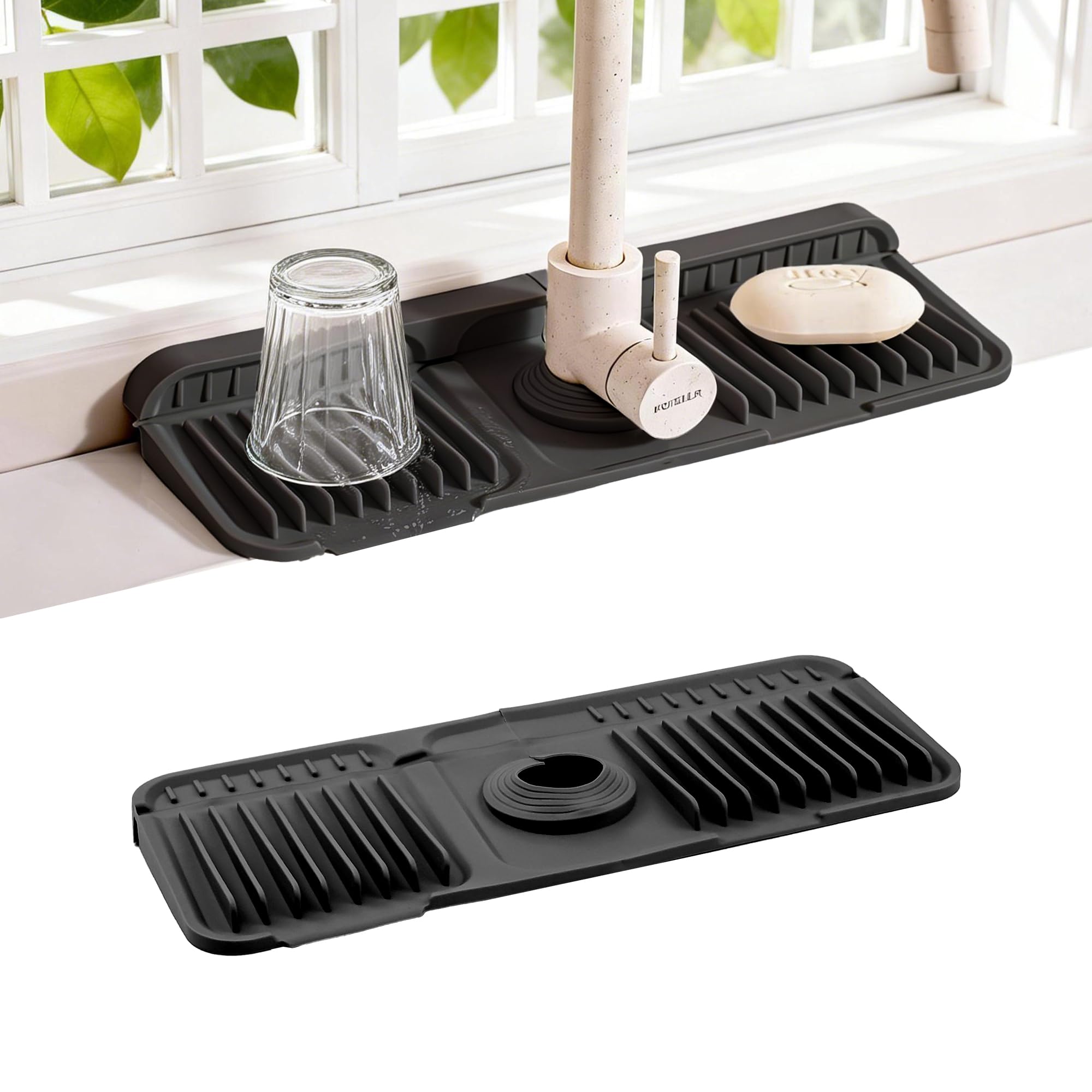 ZJWZLG Faucet Mat for Kitchen Sink, 14"X5.5" Silicone Sink Splash Guard with Soap Holder, Snap-On Design & 7°slope Fast Drain, Folding Sink Faucet Mat|Kitchen & Dining