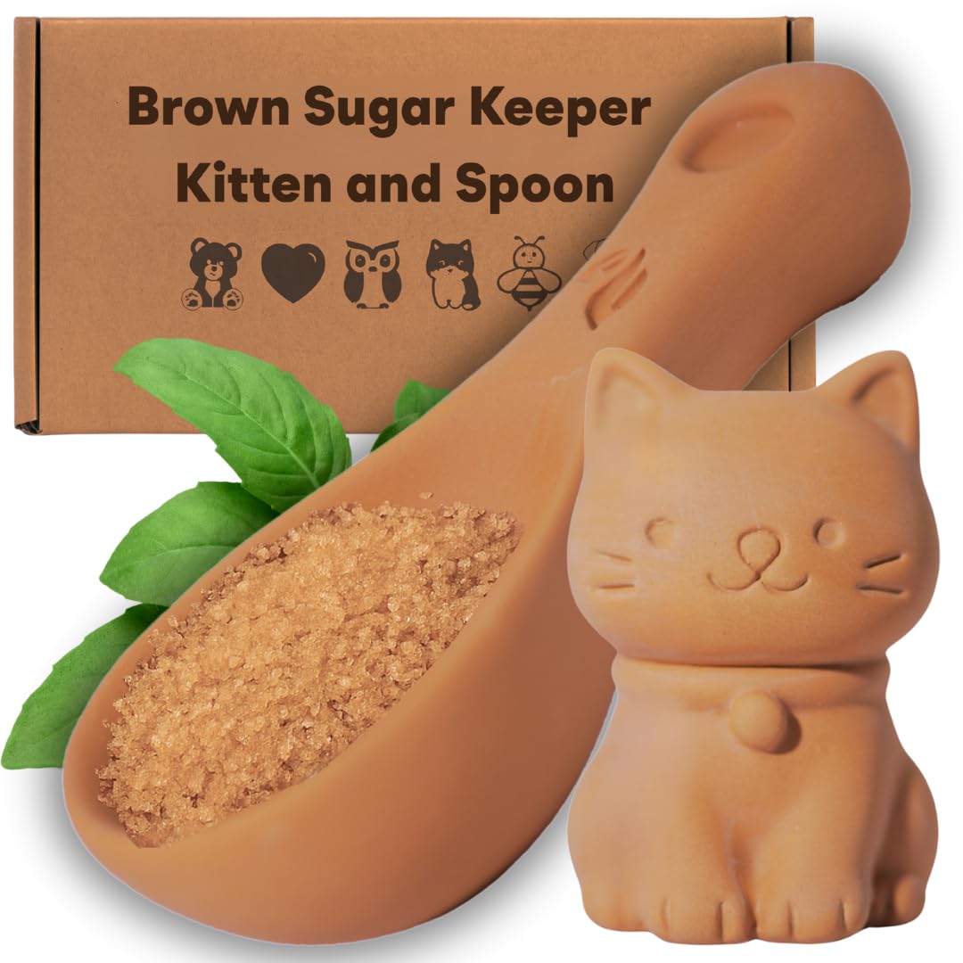 Sifri 3D Brown Sugar Keeper 2-in-1 Set – Terracotta Clay Cat & Spoon Saver Softener – Cute Kitchen Storage & Freshness Holder for Sugar – Gift for|Kitchen & Dining