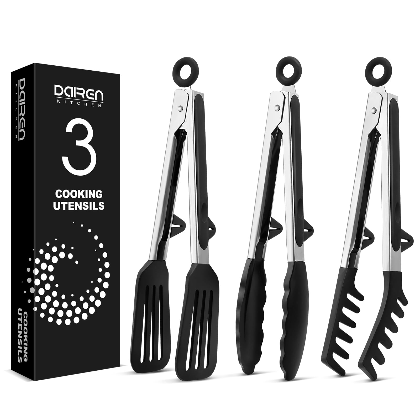 Kitchen Tongs for Cooking, 9 Inch Non Scratch Silicone Tip for Nonstick Cooking Pans, Food Grade Mini Serving Tongs, Pull Lock, Set of 3, Black|Kitchen & Dining