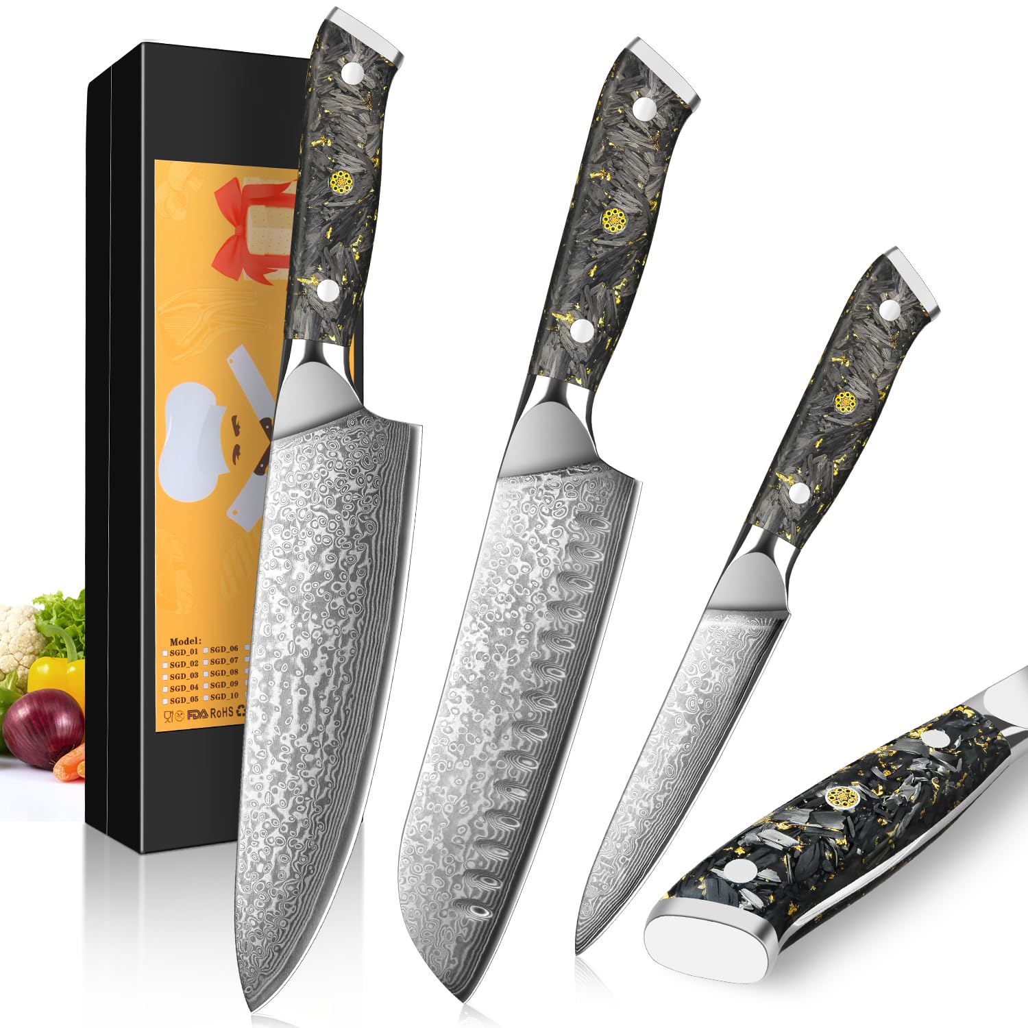 KEENZO Damascus chef knife set, Professional kitchen knives set 3 pcs, Sharp 8" Chef Knife & 7" Santoku Knife & 5" Utility Knife. Hand forged Damascus|Kitchen & Dining