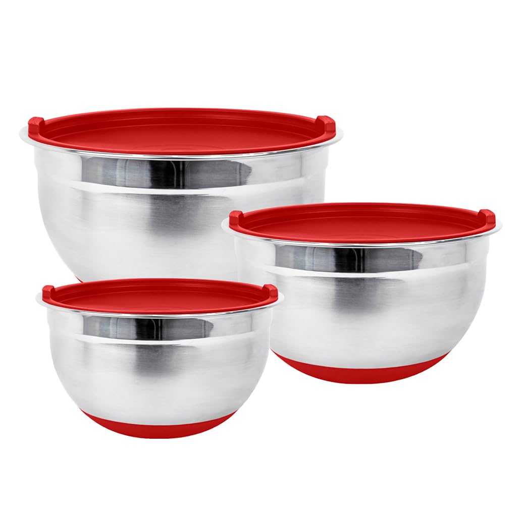 Fitzroy and Fox Stainless Steel Mixing Bowls with Lids and Non Slip Bases (Set of 3, Red)|Kitchen & Dining