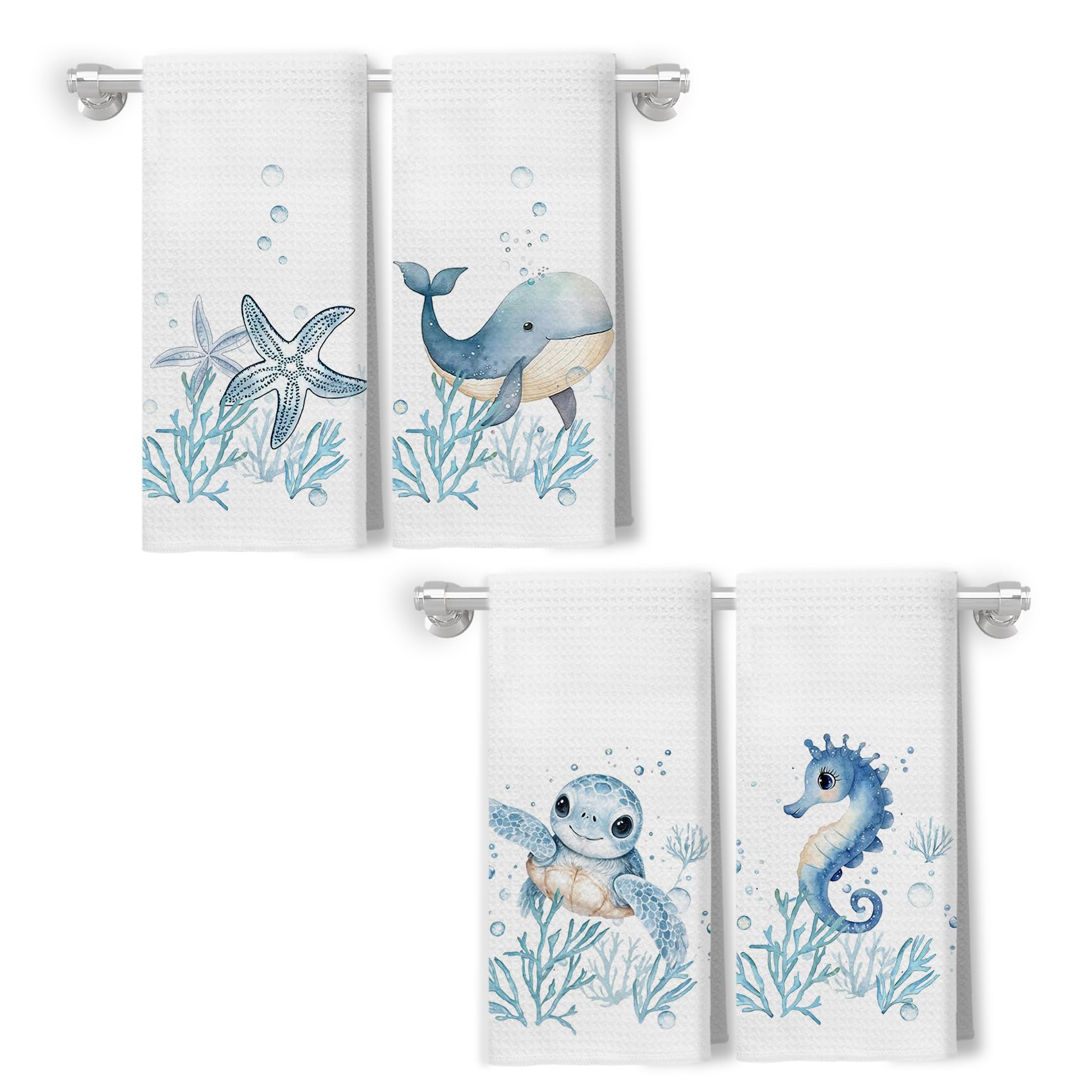XUNLURY Coastal Beach Kitchen Towels, Coastal Ocean Hand Towels for Bathroom Decor, Whale Seahorse Sea Turtle Starfish Decorative Dish Tea Towels for|Kitchen & Dining