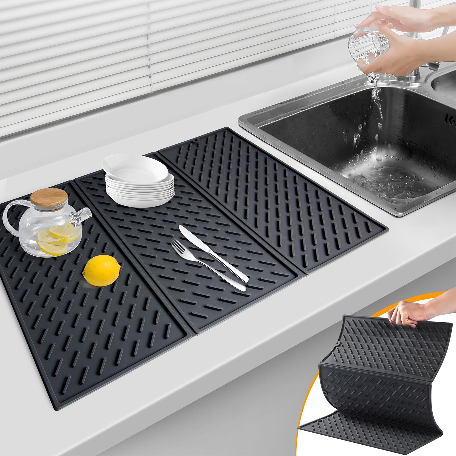 Collapsible Silicone Drying Mat, Trifold Large, Heat-Resistant, Easy Clean, BPA Free, Black (24x16in)|Kitchen & Dining