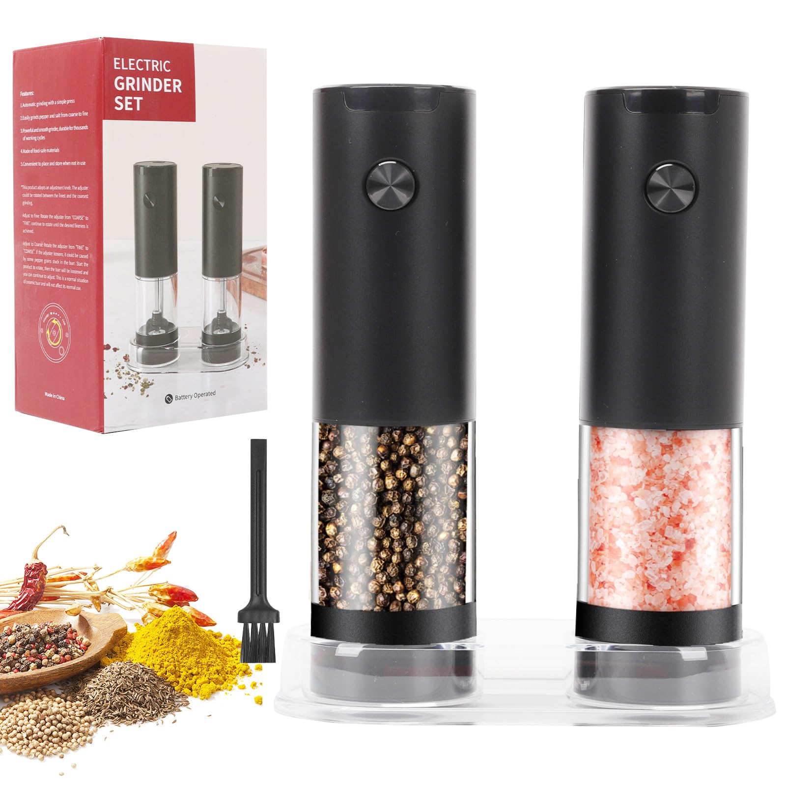 Electric Salt and Pepper Grinder Set, Automatic Pepper Mill Shakers 5-Level Adjustable Coarseness Easy Filling with LED Light and Storage Base (Black)|Kitchen & Dining