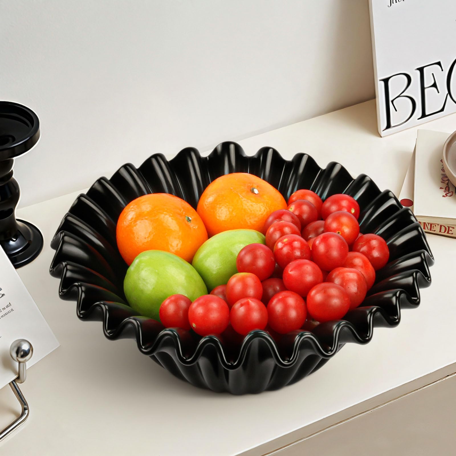 10'' Large Decorative Ceramic Bowl, Fruit Bowl for Kitchen Counter, Crinkle Design Fruit Bowl for Modern Home Decor Centerpiece, Scalloped Ruffle Key|Kitchen & Dining