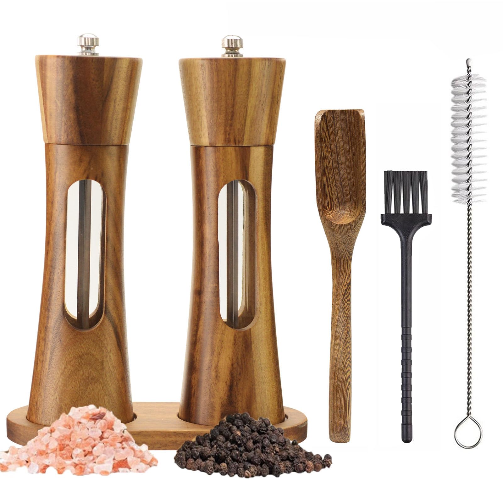 2 Pack Wooden Salt and Pepper Grinder Set — 8 Inch Refillable Salt and Pepper Shakers — Manual Spice Mills with Clear View Window — Ceramic Grinder,|Kitchen & Dining