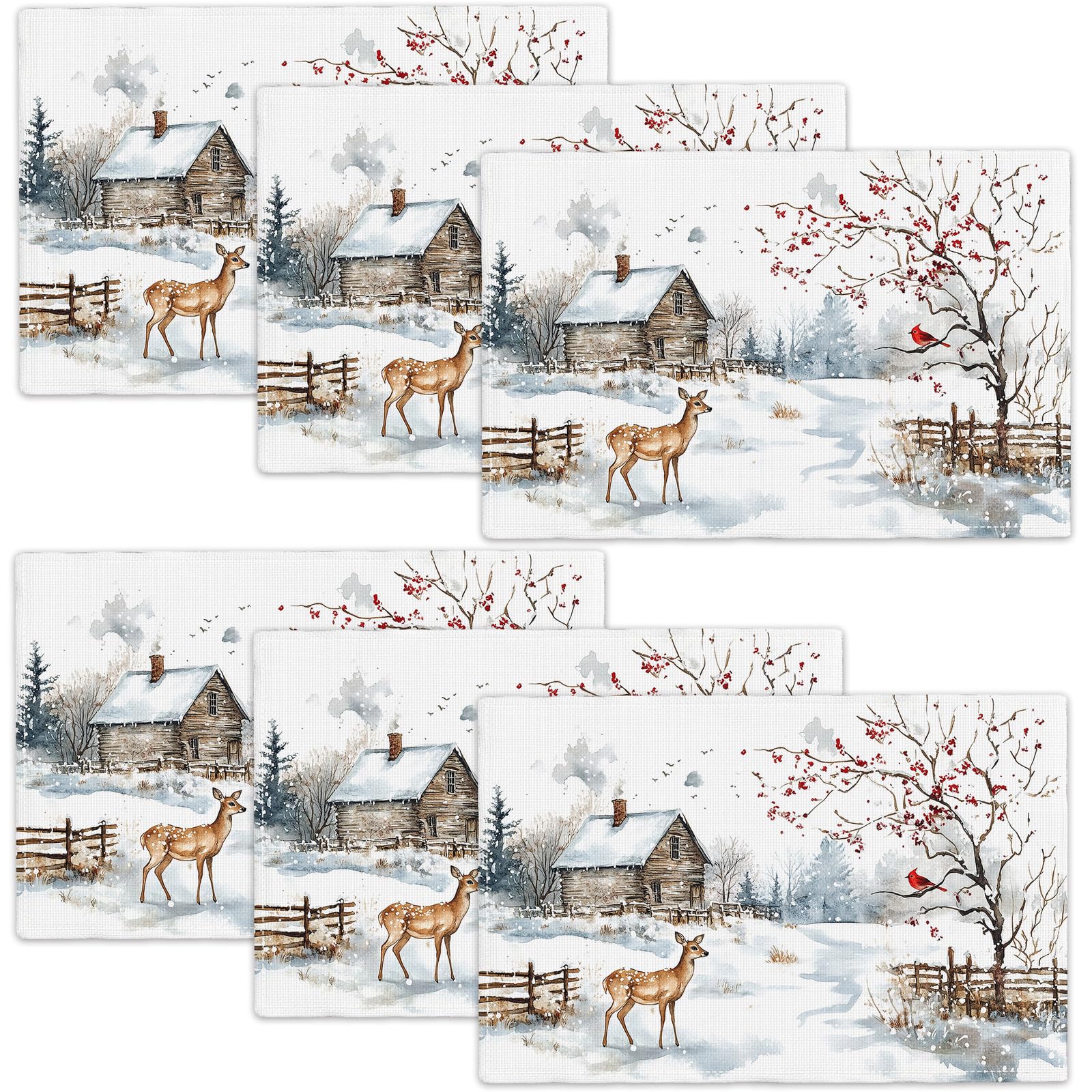 Farmhouse Deer Placemats Set of 6 Deer Barn Cardinal Table Mats Rustic Winter Landscape Place Mats 12x18 Inch for Party Kitchen Dining Restaurant|Kitchen & Dining