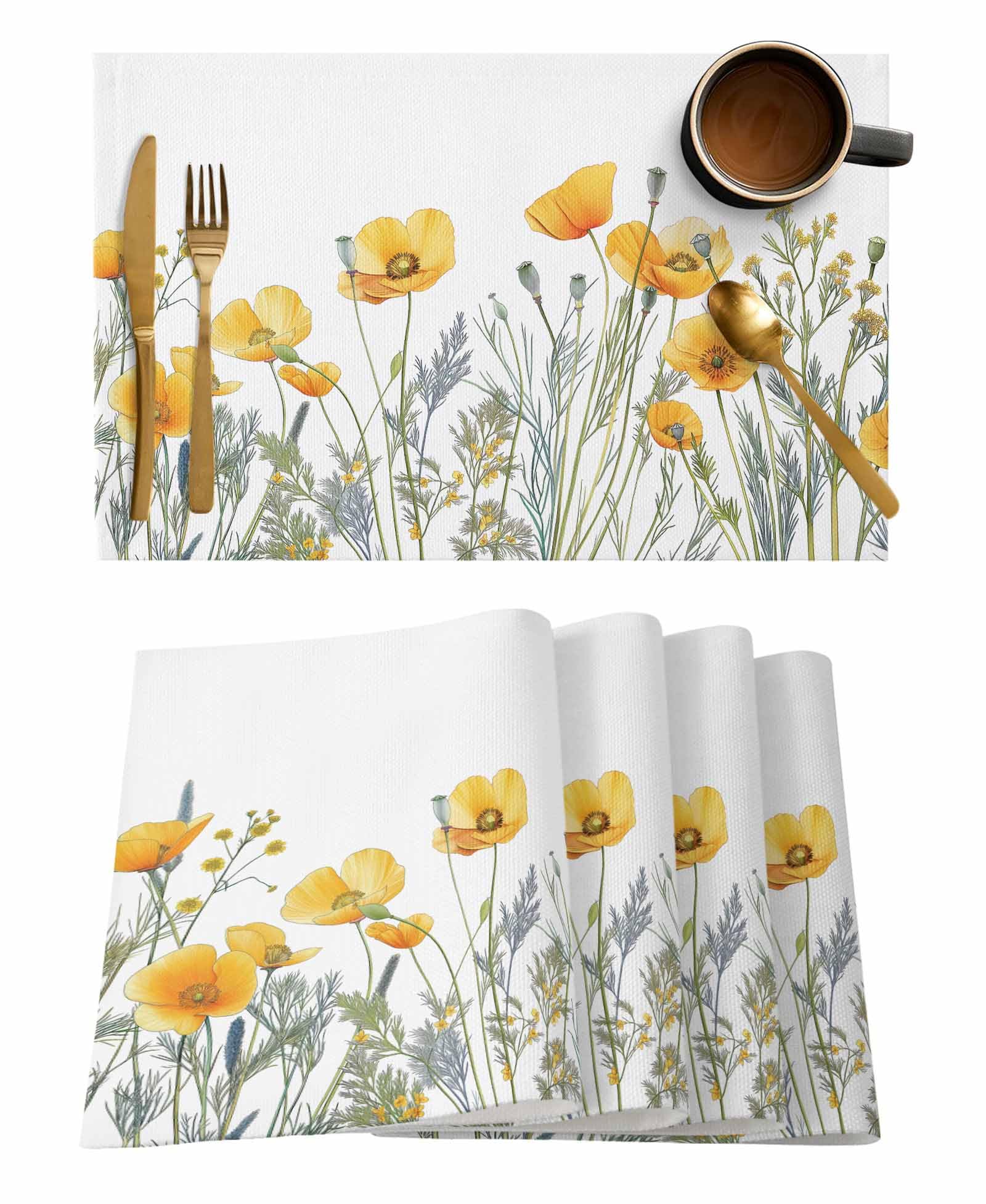 Ianokkcant Placemats Set of 8, Yellow Spring Floral Woven Placemat, Linen Place Mats for Kitchen/Dining Tables, Watercolor Summer Botanical Washable|Kitchen & Dining