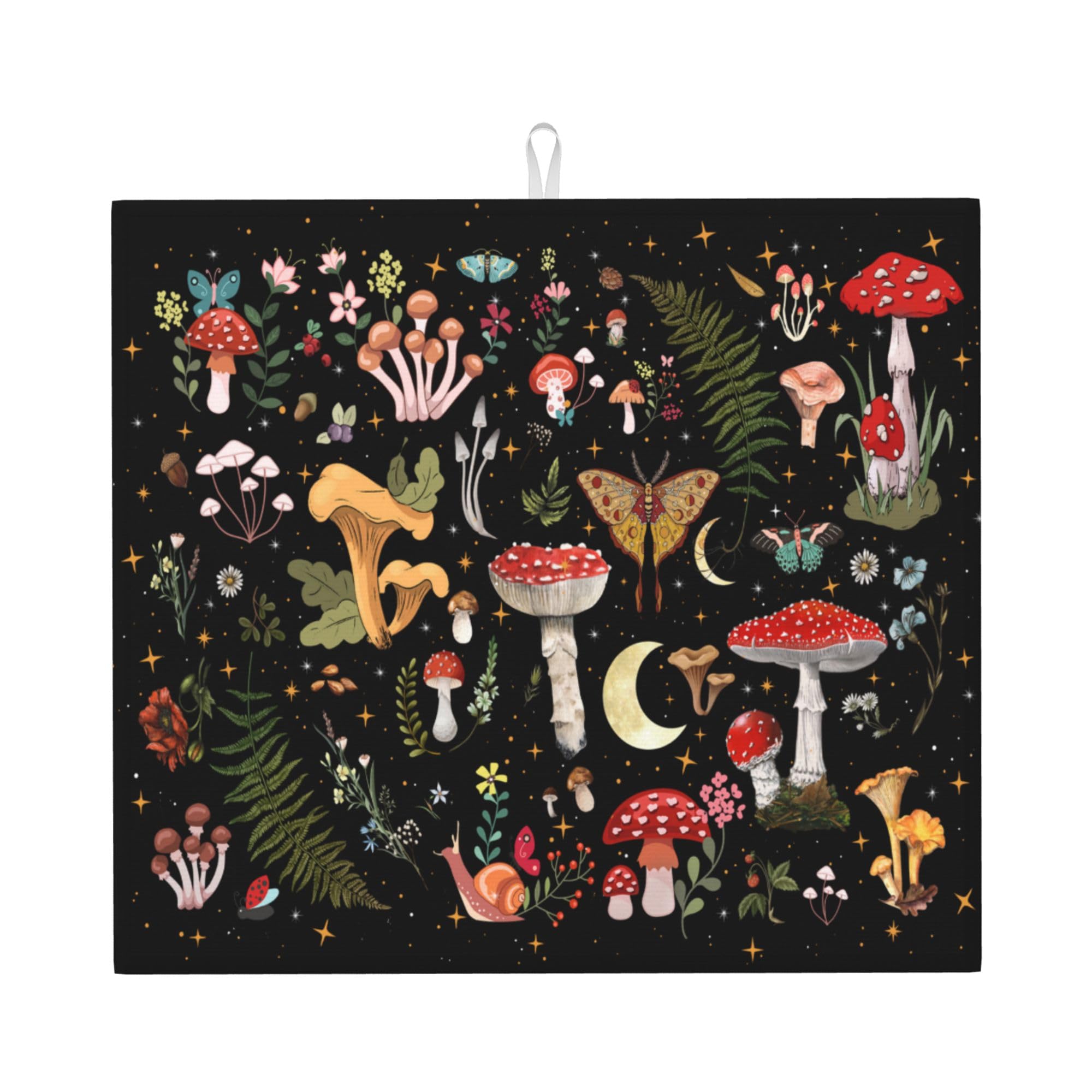 Mushroom Dish Drying Mat for Kitchen Counter Moth Gothic Witchy Dish Drainer Rack Mats 16x18 Inch Absorbent Reversible Black Drying Pad|Kitchen & Dining