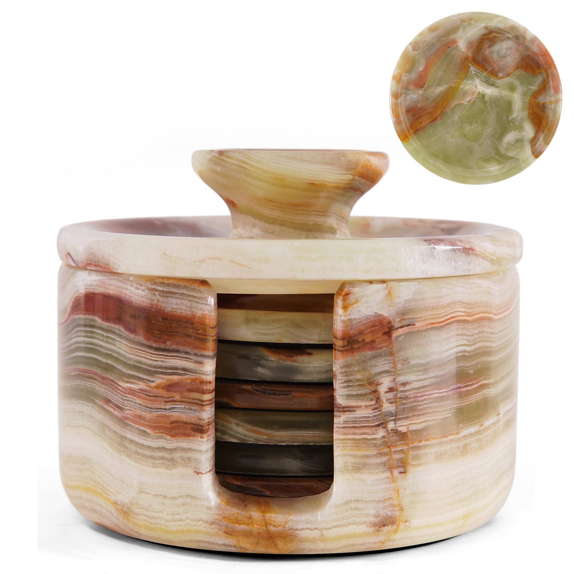 Earthen Crafts Marble Coasters Set of 6 for Drinks 3.5" Green Onyx Round Stone Drink Coaster with Holder & Lid for Table Countertop, Kitchen Counter &|Kitchen & Dining