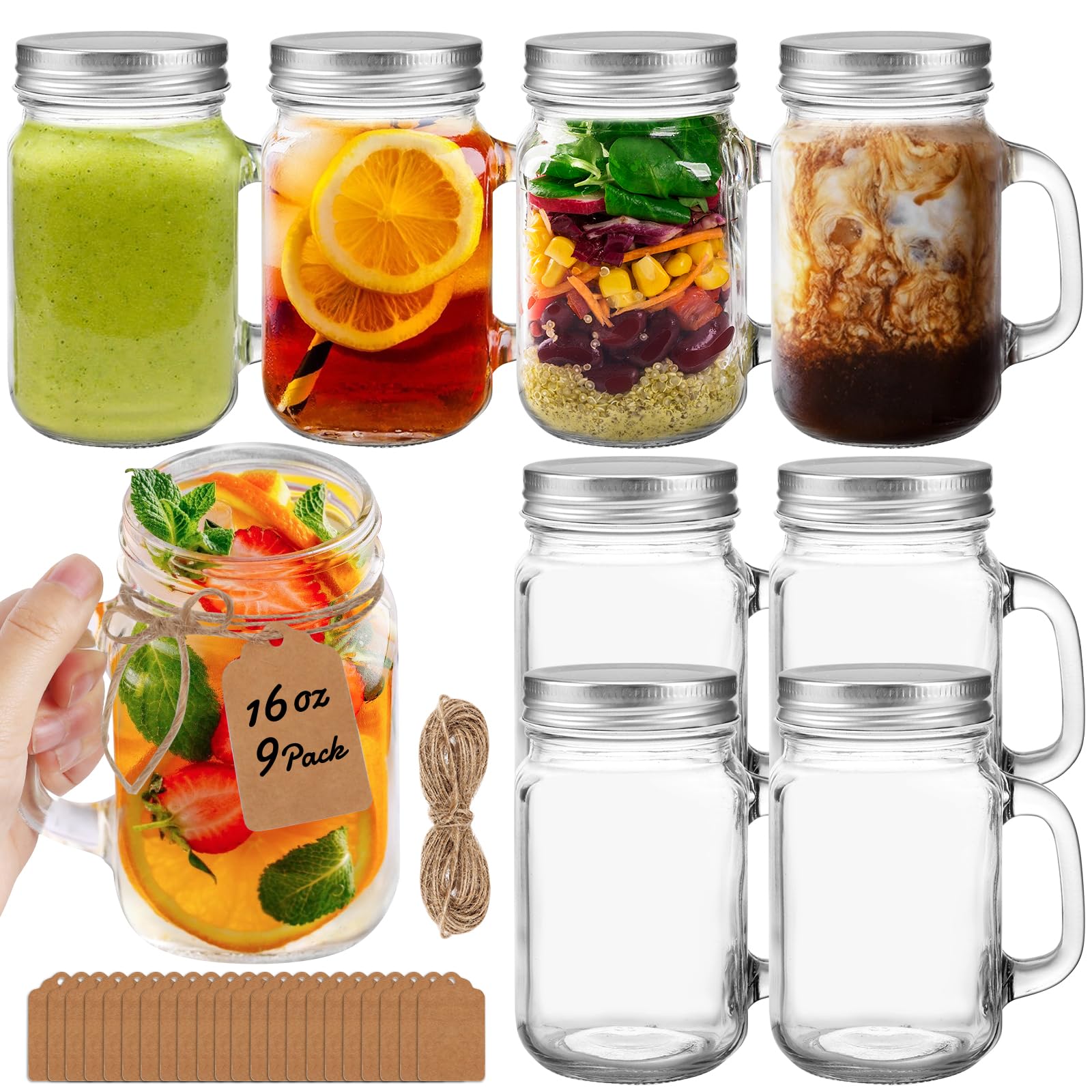 Jaisie.W 16oz Mason Jars with Handle 9Pack, Mason Jar Mugs with Handles with Handle & Screw Sliver Lid for Juice, Kombucha, Tea, coffee, Kitchen,|Kitchen & Dining